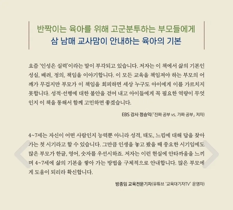 또한 <기본 가치 육아>는 교육계에서 이미 뛰어난 영향력을 발휘하고 계신 두 분으로부터 귀한 추천사도 받았습니다.