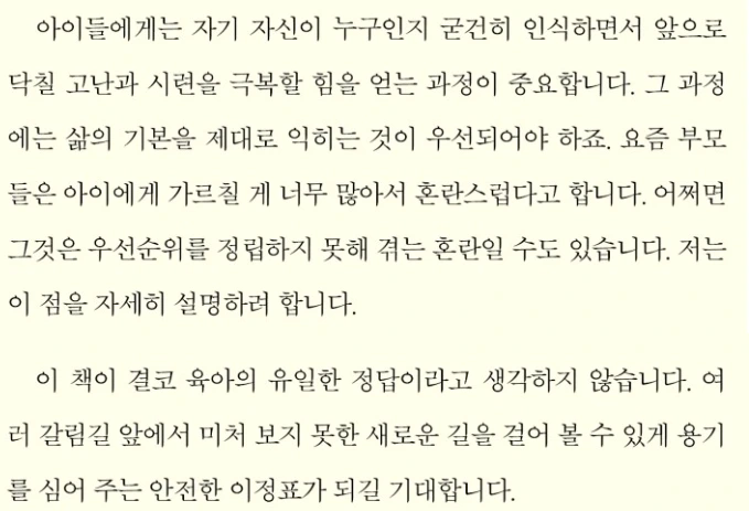 입니다. 누구나 위의 '기본 가치'에 주목하면 육아는 오히려 해볼 만하다고 생각하실 수 있도록 용기를 더해드리고 싶습니다. 저는 책에서 기본 가치를 세 아이에게 전하는 과정에서 겪게 된 시행착오를 진솔하게 드러냈습니다. 또 그 과정에서 새로이 깨닫게 된 효과적인 양육방법을 사례를 중심으로 구체적으로 설명해 두기도 했어요.
