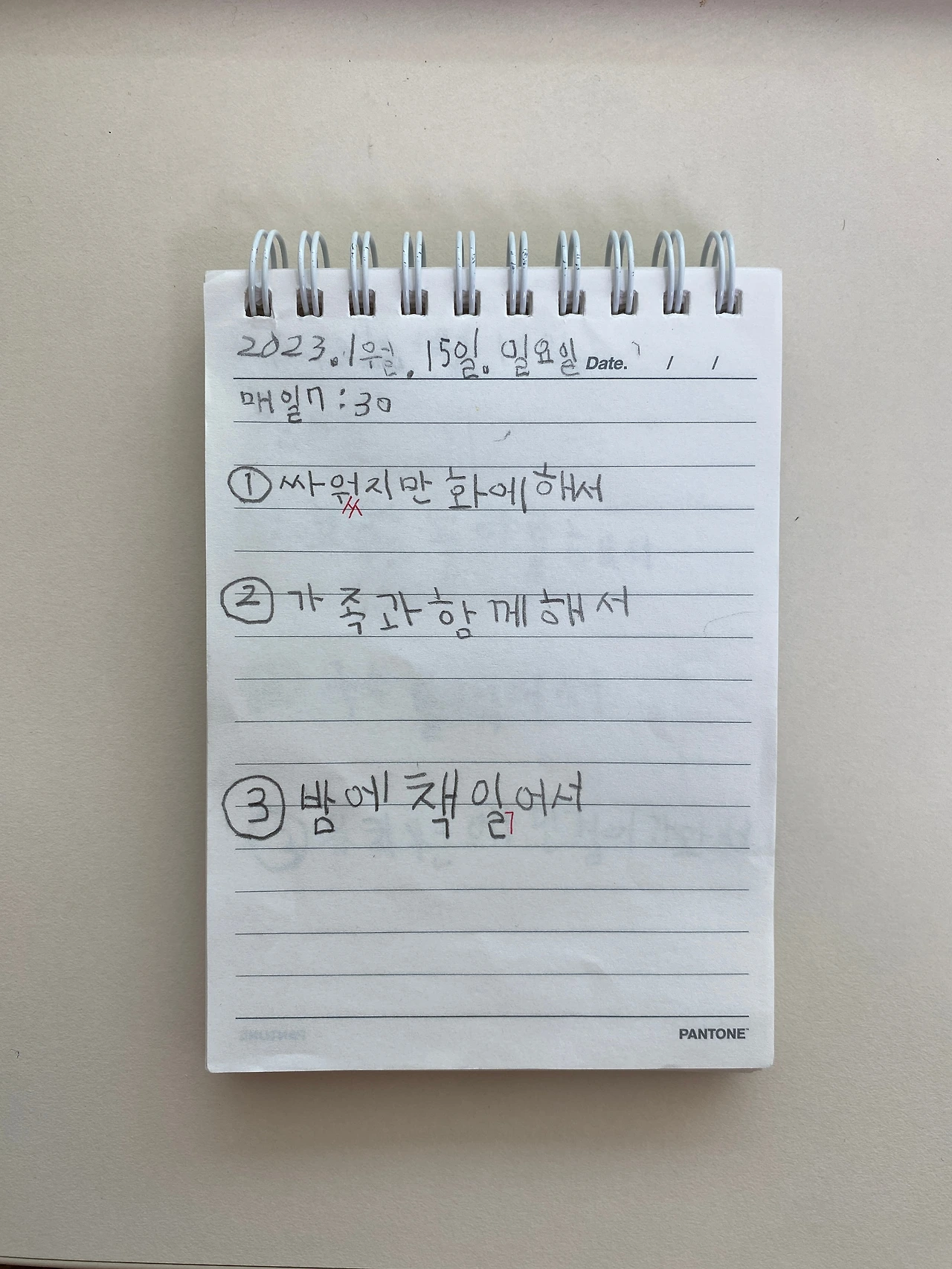 저와 첫째는 하루를 보내고 잘 준비를 마치면 같이 작은 방으로 들어가서 감사일기를 씁니다. 오늘 하루 중 감사했던 것에 대한 글을 3가지로 정리해서 쓰고 상대방에게 읽어줘요. 그리고 한 명이 대표로 마무리를 하고 마칩니다. 하루하루 써온 감사일기가 어느덧 쌓이고 쌓여 아이는 이제 두 번째 수첩을 마련했어요. 두 달이 지나자 일상의 많은 것이 바뀌었습니다.