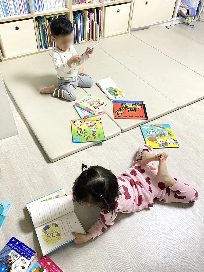하지만 그 강의를 듣고 나서 아이들의 모습을 조용히 지켜보니 실제 삶은 전혀 다르더라고요. 첫째가 읽는 문고판 책을 둘째가 옆에서 같이 듣고 있습니다. 또 때로는 셋째가 들고 온 책이 세 살 위인 둘째가 좋아하는 책인 적도 자주 있습니다.