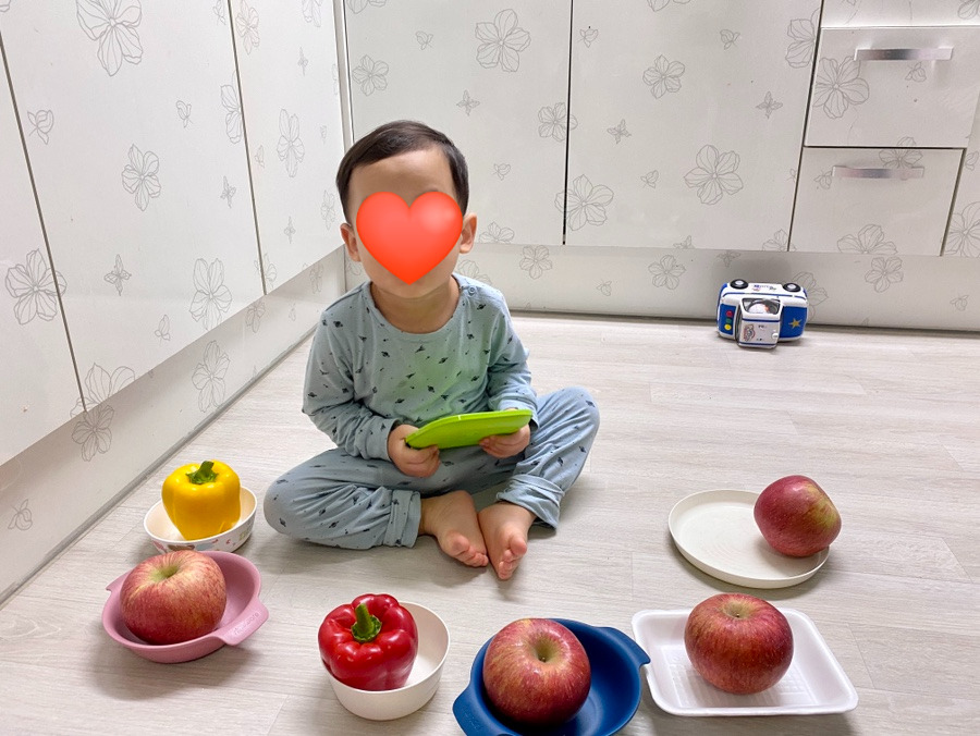 또 한 날은 요리하던 내 옆에 온 막둥이가 사과와 파프리카를 보더니 까치발로 서서 그것들을 하나하나 다 바닥으로 내렸다. 이어서 수납장에 있던 그릇을 꺼내서 담더니 나와 누나들에게 먹어보라는 시늉을 한다. 그날 나는 갑작스럽게도 막둥이의 행동을 통해 아이들에게 허용해 주는 그 바운더리가 충분하다는 느낌을 받았고 이 공간 안에서 아이들이 안전하게 노는 모습이 참 편안하게 느껴졌다.