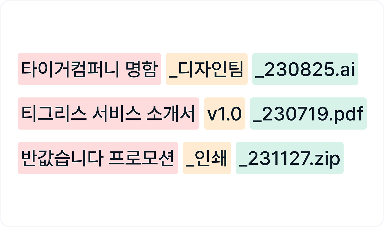 파일명은 되도록이면 통일하는 게 좋습니다. 큰 변화가 있을 때는 버전을 달리해서 버전 별로 저장하고, 최종 작업한 날짜를 기준으로 작성합니다. 티그리스 디자인팀은 [업무내용-버전-날짜]로 정리하고 있어요.