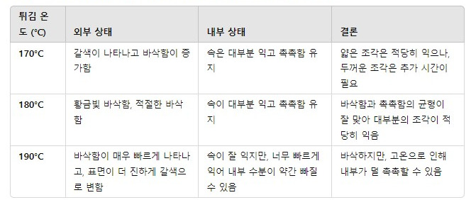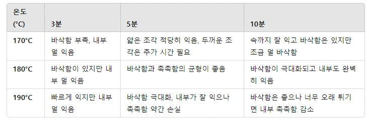 같은 온도에서도 시간을 늘리면 너무 과하게 튀겨져 버릴 것이다.