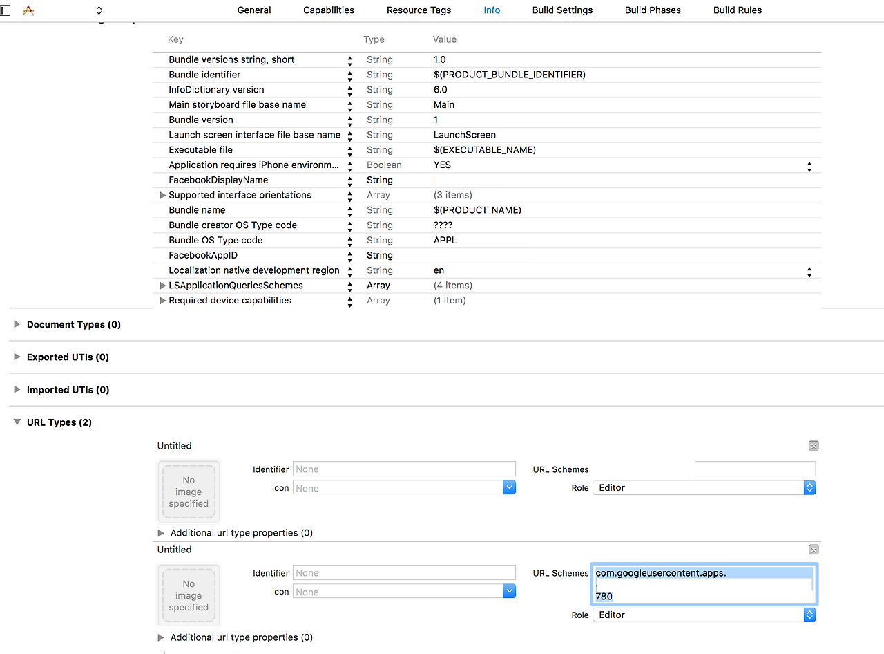 Project 를 선택하고 -> Target -> Info 에서 URL Types 에 위 내용을 추가하자.