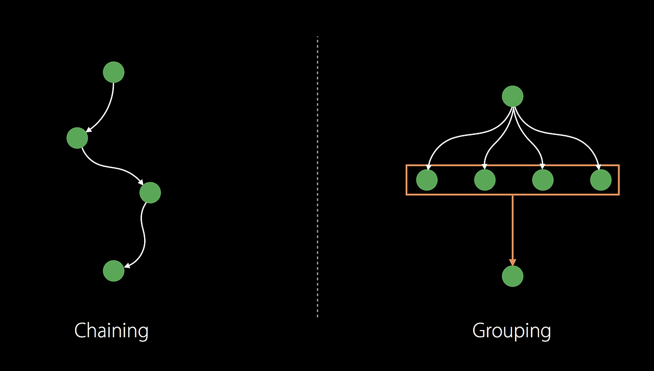 체인 형태는 1번 예제처럼. queue 가 async task 를 끝내고 다른 async queue 를 수행하는 형태를 생각하자. 그룹핑 형태는 queue 들이 각자의 동작을 수행하고 종합해서 수행되는 형태이며 아래에 두 패턴을 잘 표현한 그림이 있다.