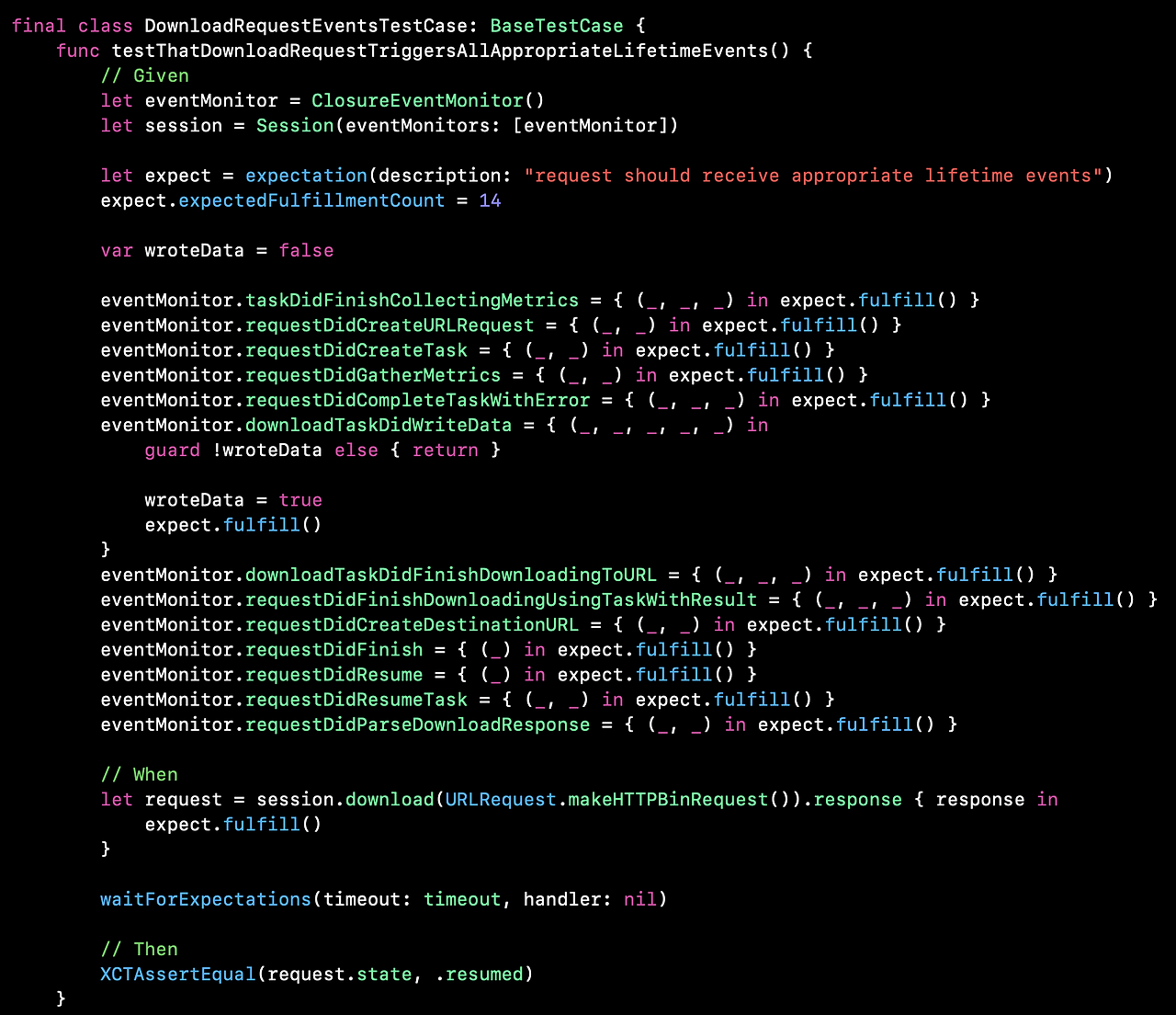 travis-ci 에서 테스트가 실패해서 병합이 안되고있는 상황에 놓여있는 PR이었는데, 어떤 테스트인지 관심이 생겨 Alamofire 테스트 코드를 조금 살펴보았는데, 매우 촘촘하게 짜여지고 깔끔하게 잘 작성된 테스트였다.