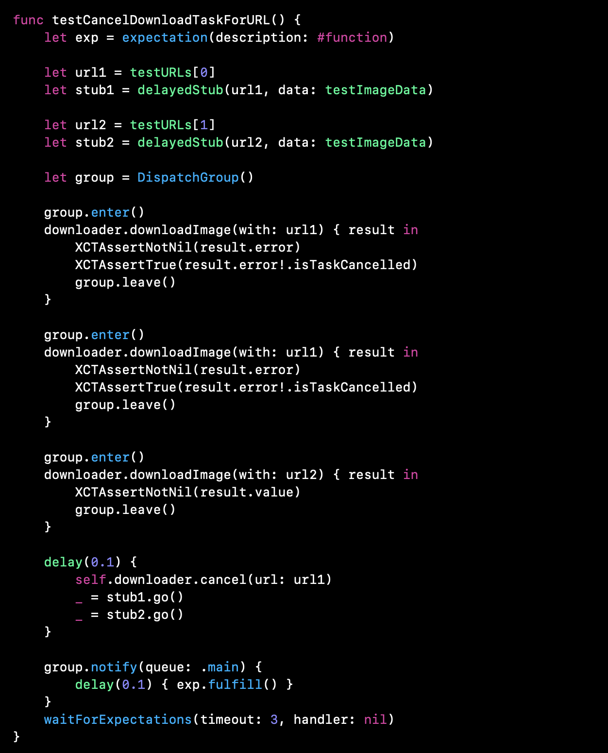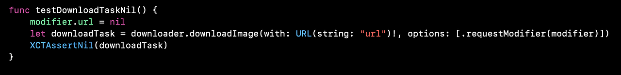 아래는 modifire.url 이 nil 일때 downloadimage 반환 task 가 nil 인것을 테스트 하고 있다.