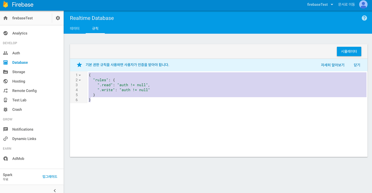 firebase 의 기본 database rule 이 아래와 같이 인증이 필요한 상태로 되어있기 때문이다.