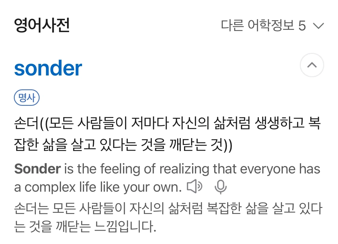 이러한 감정을 sonder라고 부른다. 모든 사람들이 자신만큼이나 복잡한 삶을 살고 있다는 걸 알게 되는 것. 타인을 이해하는 시선은 자신의 경험을 통해서 확장될 수 있다고 생각한다. 내가 5년이 넘는 시간 동안 괴로움을 겪지 않았더라면, 지금과 같은 감사함을 느낄 수 있었을까?