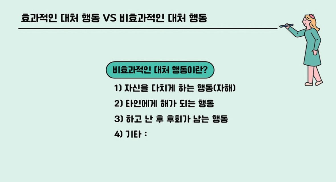 그러나, 가장 명심해야 할 점은 이게 효과적인 대처방법인지, 비효과적인 대처방법인지 구분하고 알아차려야 한다는 것이다. 보통 당사자는 스스로 알아차리기 힘들기 때문에 주변에서 얘기해 줄 필요가 있다. (그 당시에 나는 이걸 알아차리지 못했고, 대부분 나의 자해행동에 대해서 무관심했다. 아니면, 그들도 어떻게 조언을 해줄 수 있을지 몰라서 망설였을 거다.)