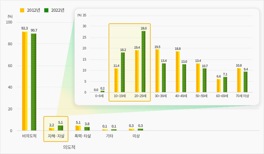 그중에서 2022년 손상유형 및 원인통계(질병관리청)에 따르면 특히 자해·자살 환자 중 10~20대 비율이 10년 새 15.4% 증가하는 것으로 나타났더라고요.