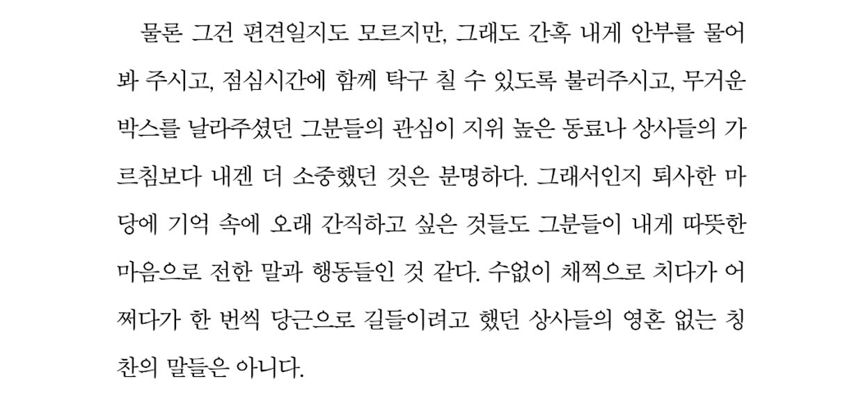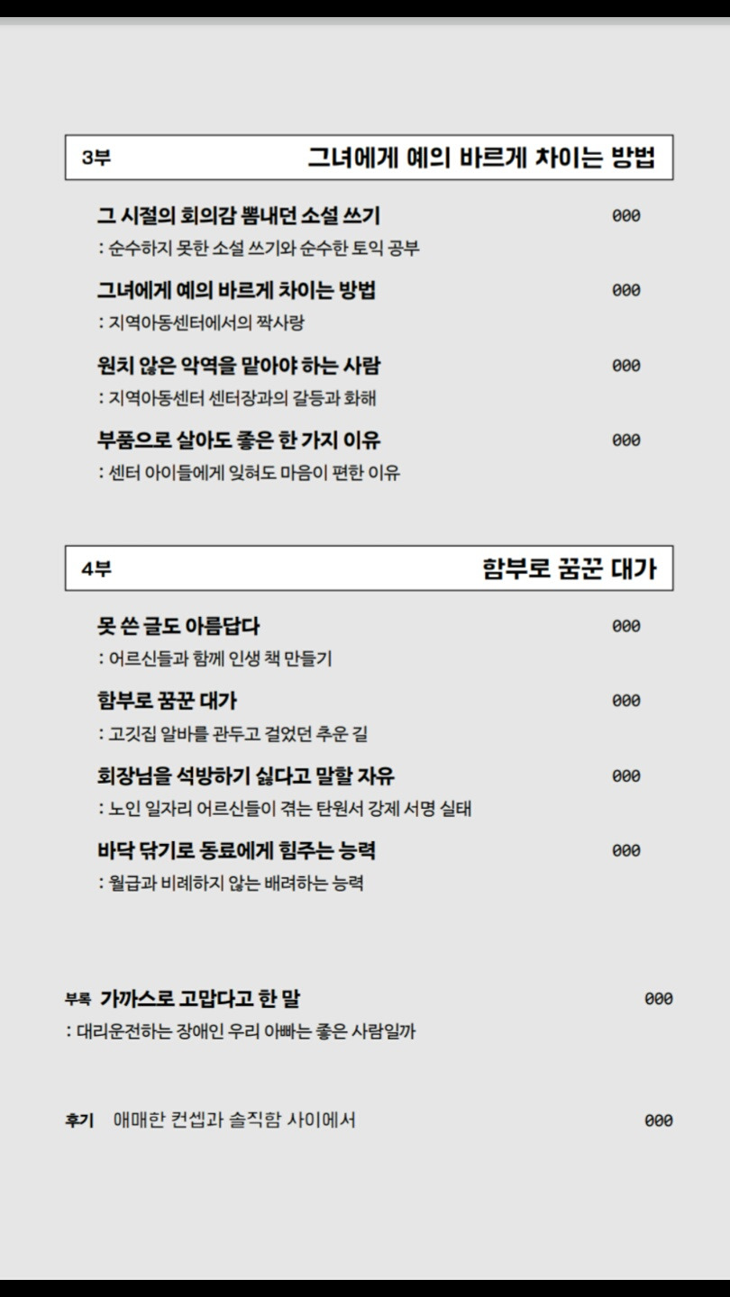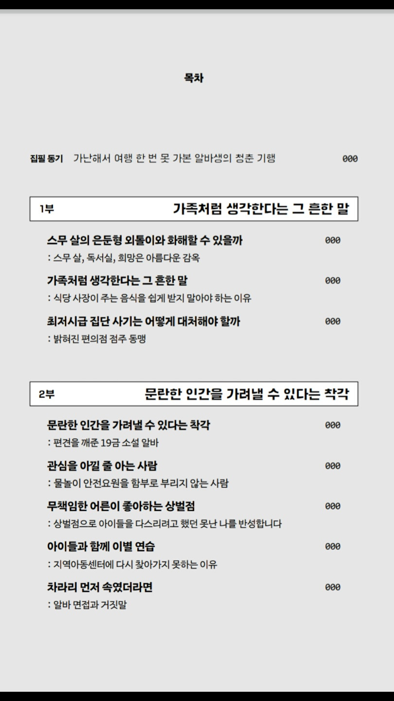 ▷ 존경하는 사수를 통해 알게 된 타인에 대한 배려심. 인성 나쁜 줄 알았던 상사와의 다툼과 화해의 과정. 어르신들에게서 배운 순수한 글쓰기의 가치. 스스로의 못난 모습을 반성하게 했던 짝사랑 경험 등. 알바 현장에서 만난 인연들에게서 얻은 깨달음과 그분들의 삶을 관찰한 얘기를 담고 있습니다.