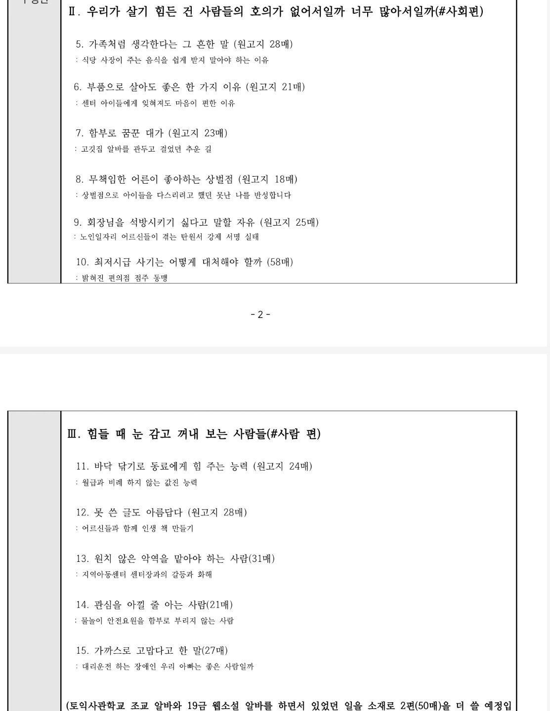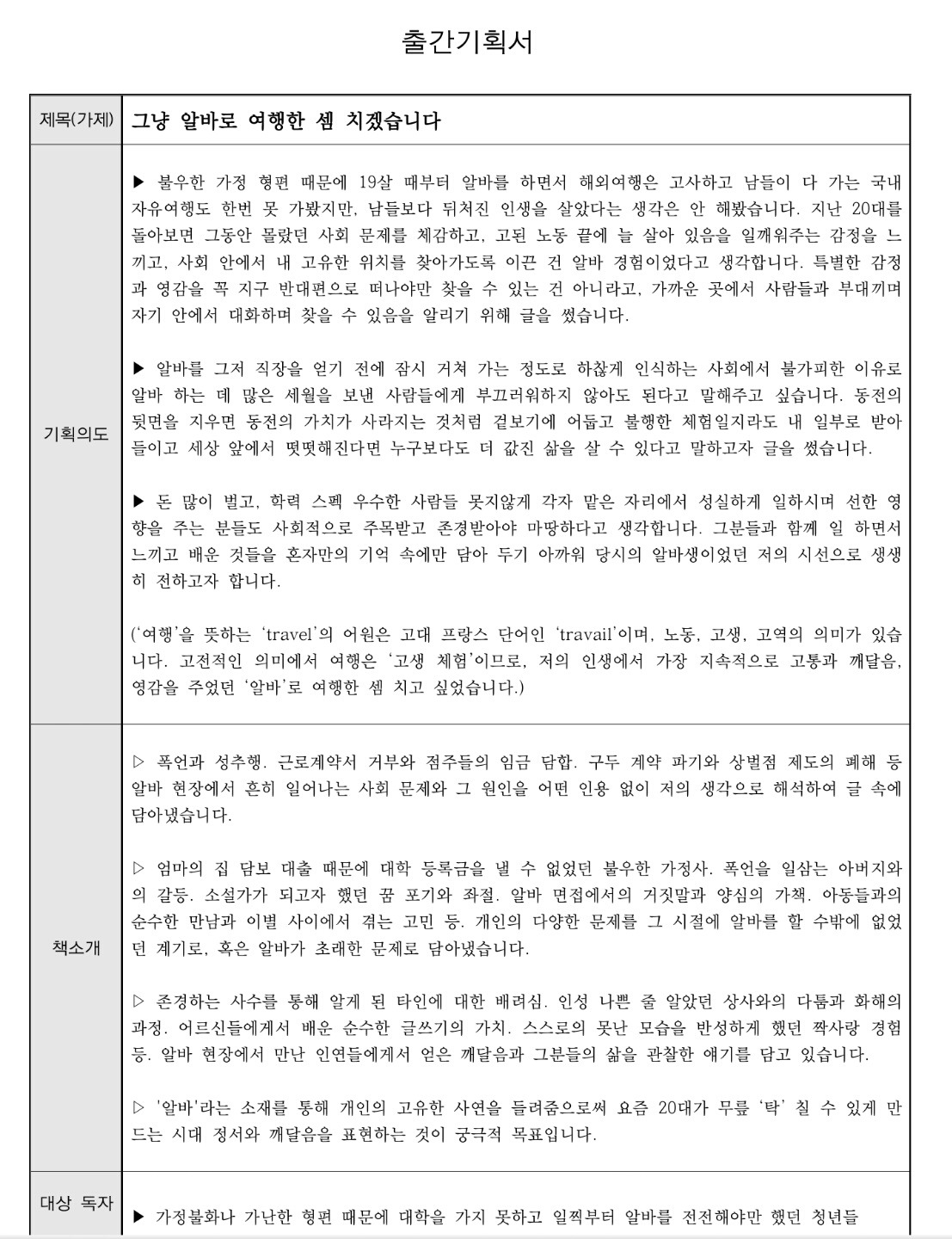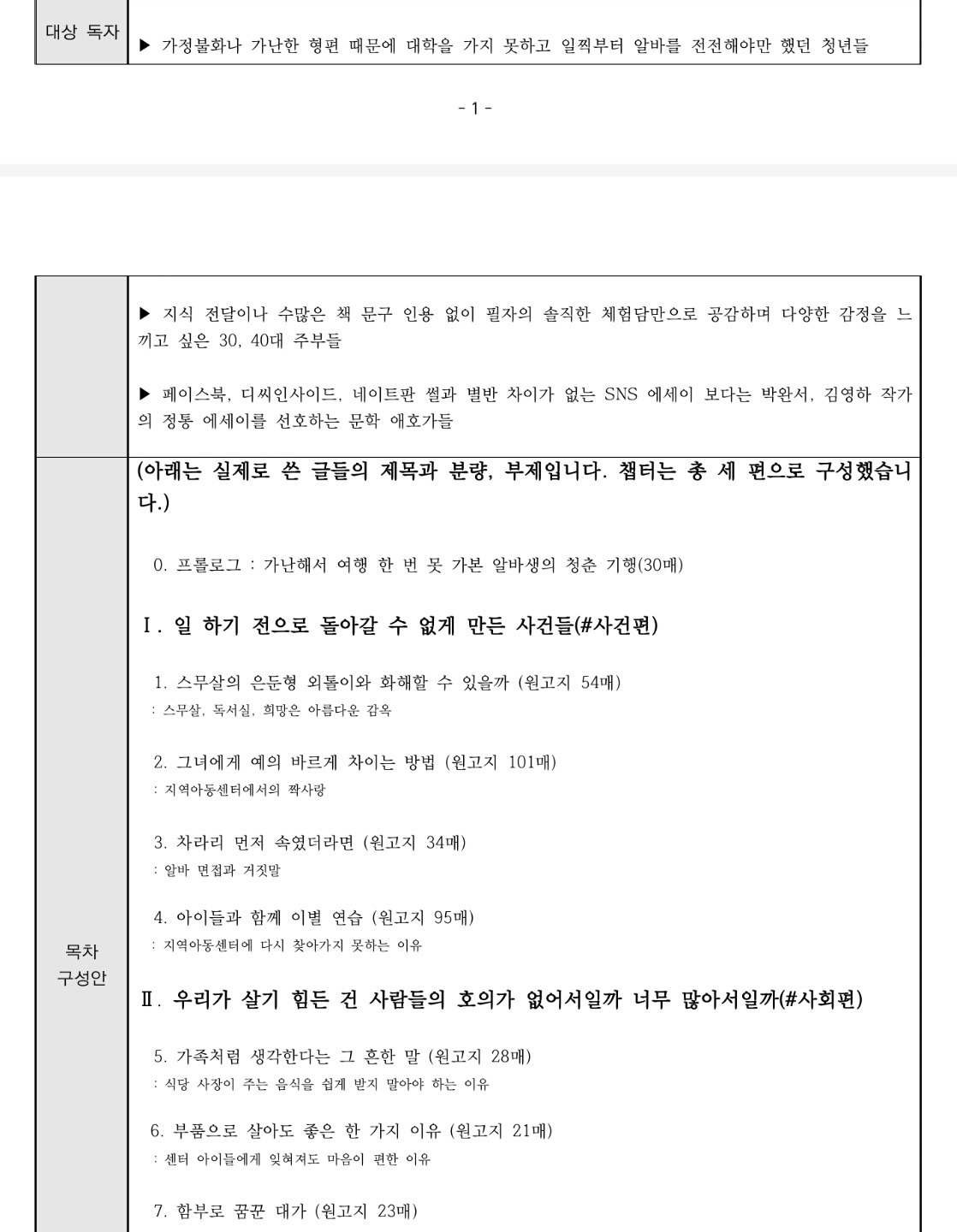 애초에 출간기획서의 경우에 텀블벅에서 책을 많이 구매해 주시는 분들한테만 공유해 드릴 생각이었는데, 현재까지의 추세만 봤을 때 텀블벅 모금에 실패할 가능성이 높아서ㅠ 고민 끝에 조건 없이 공유해 드리려고 합니다.