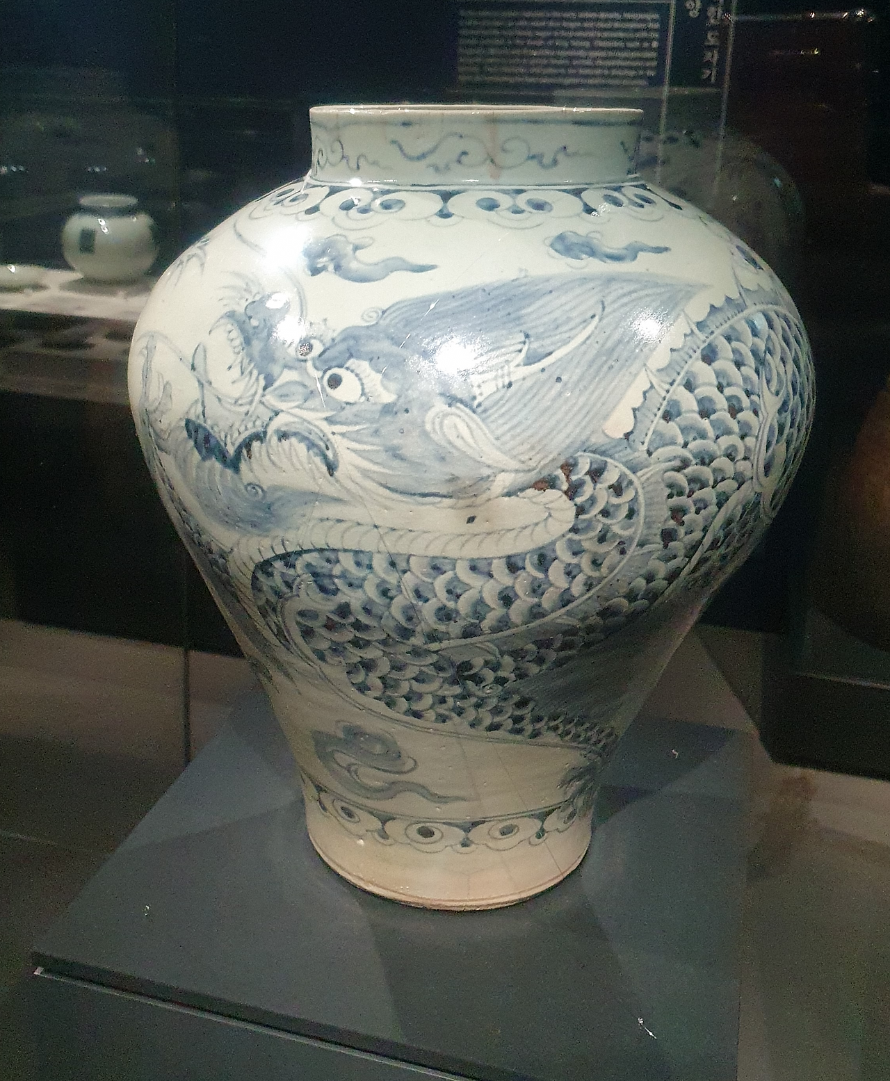 *청화 백자 운룡문 호(조선): 왕실의 잔치에서 술을 담거나 꽃을 꽂아 위엄을 세우던 항아리입니다. 하얀 바탕 위를 역동적으로 유영하는 푸른 용의 모습은 조선 왕실의 당당한 기상을 보여줍니다. 현재 서울공예박물관에서 그 푸른 기운을 직접 만나보실 수 있습니다.