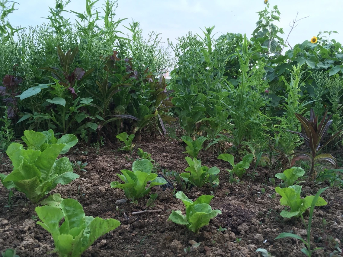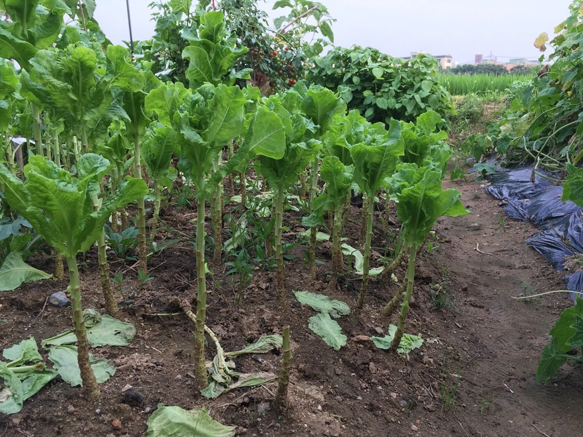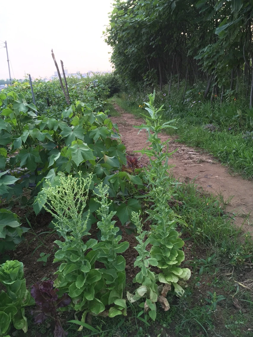 이건 더 재밌다. 아래는 줄기만 남고 위에서 상추가 자란다. 수상가옥 띄어놓듯이 뭔가 띄워서 키우고 있는 그런 느낌? 우리 농원은 전부 유기농인데 왠지 벌레를 피해보려는 상추의 노력같아보인다.