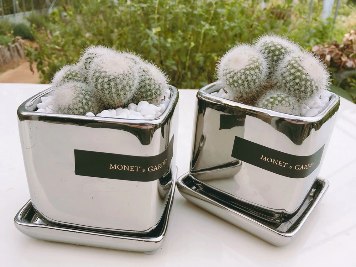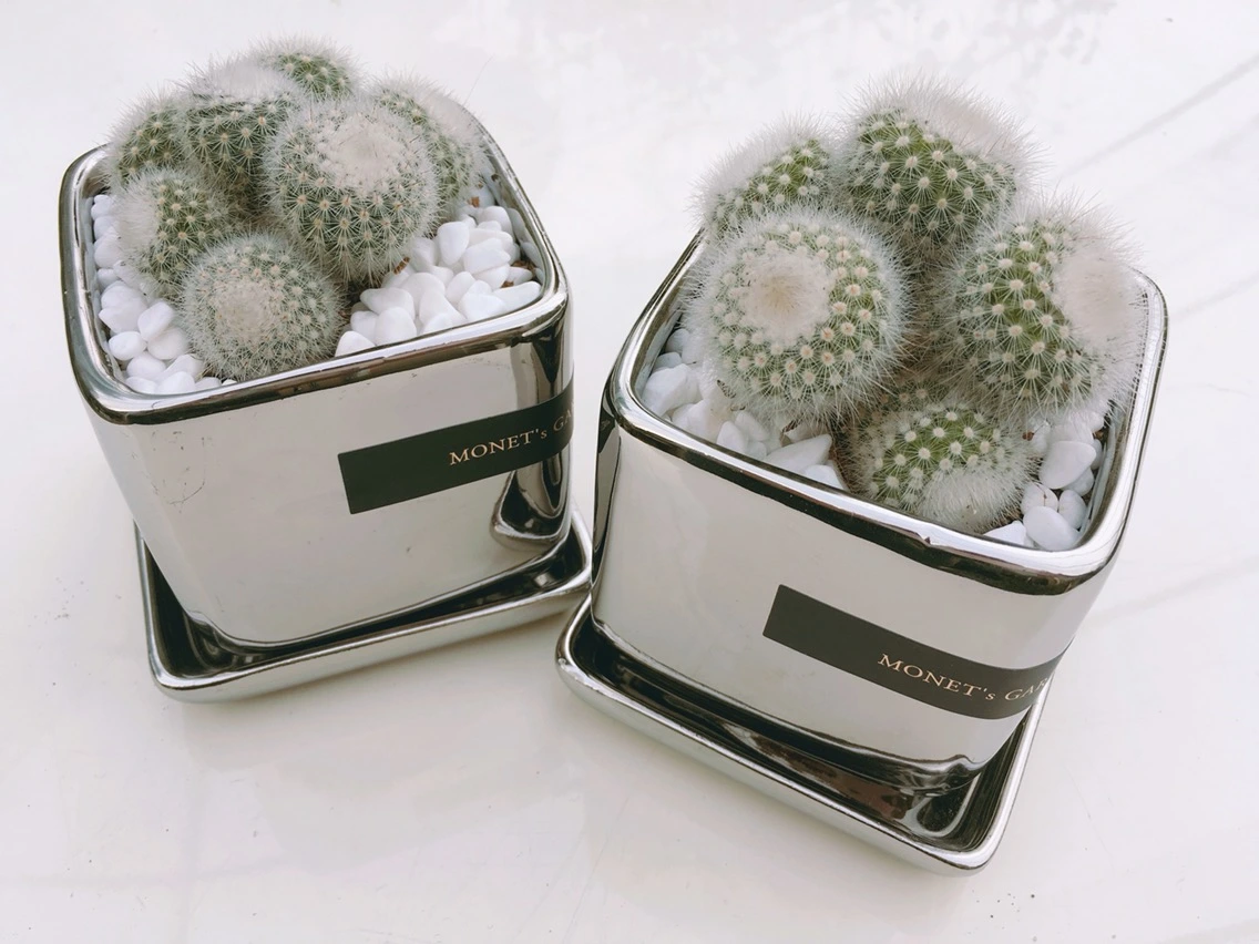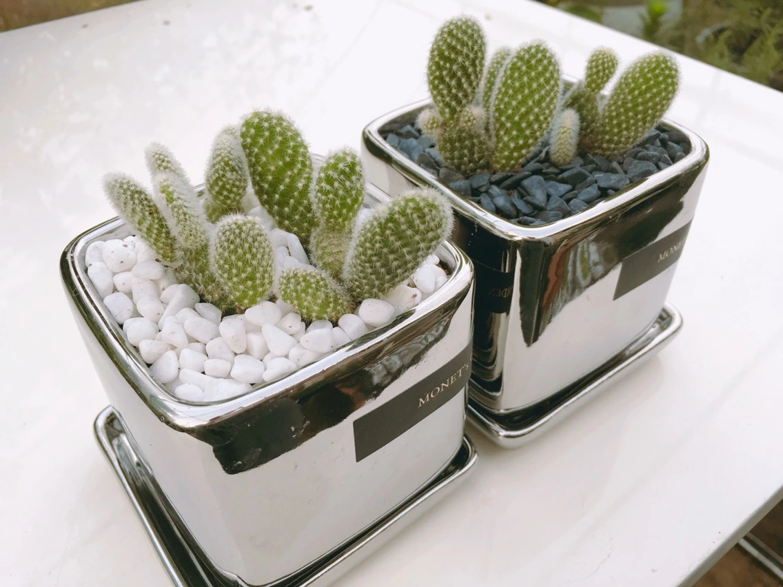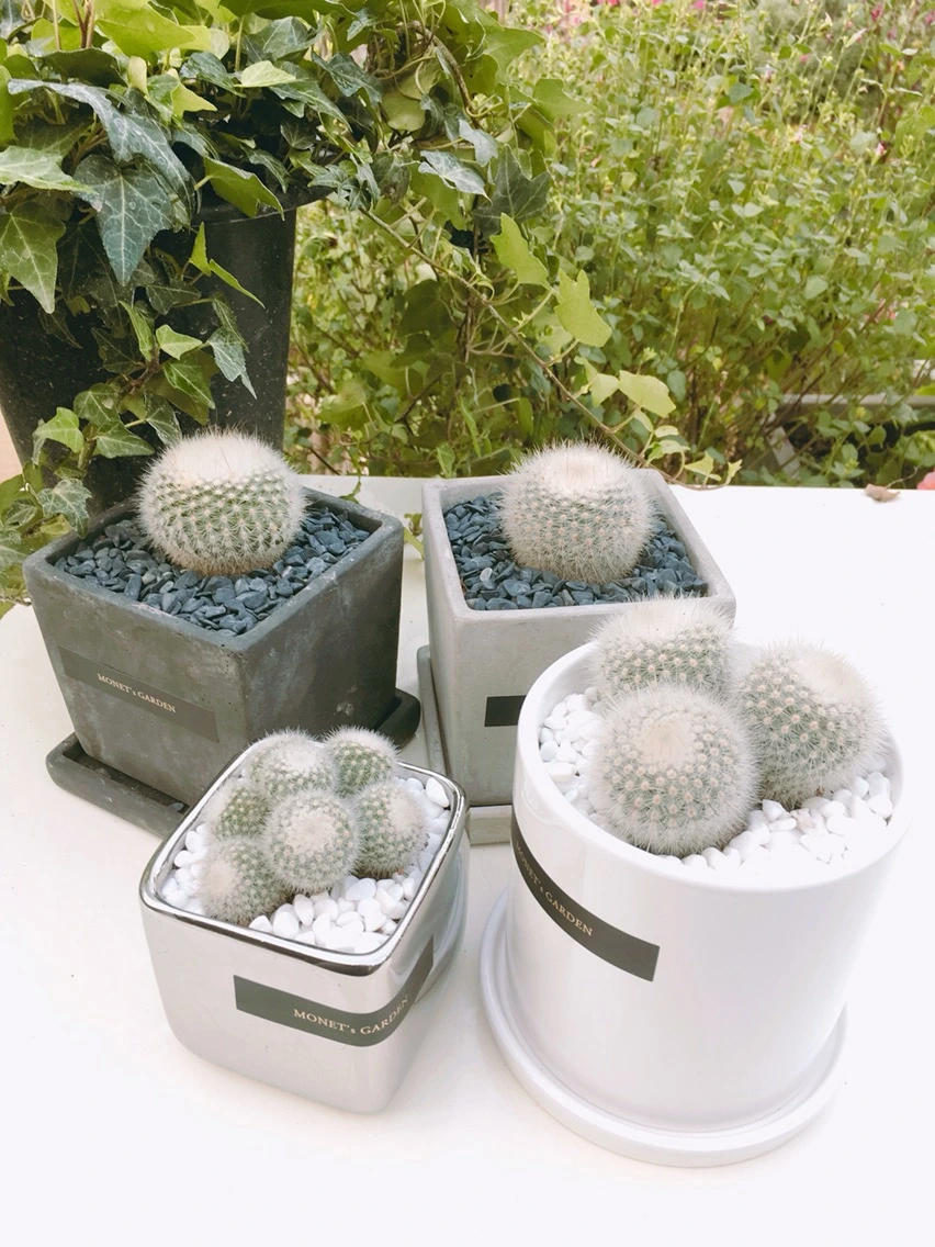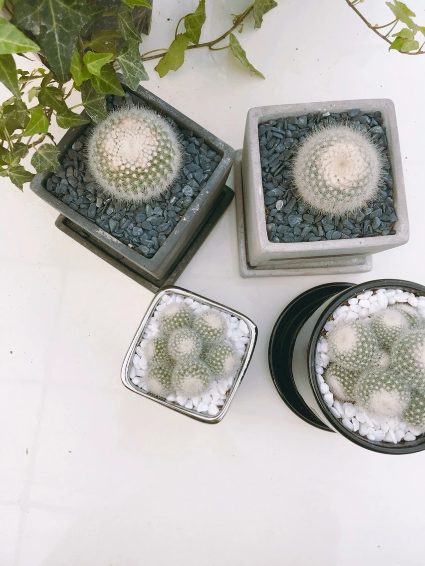주로 메탈 화분을 많이 사용하는데, 정말 색감이 메탈화분과 환상적인 조화다. 하얀 조약돌을 깔아주니 전부 다 번쩍번쩍 하얗게 빛나는 기분이다. 화사하기까지하다.