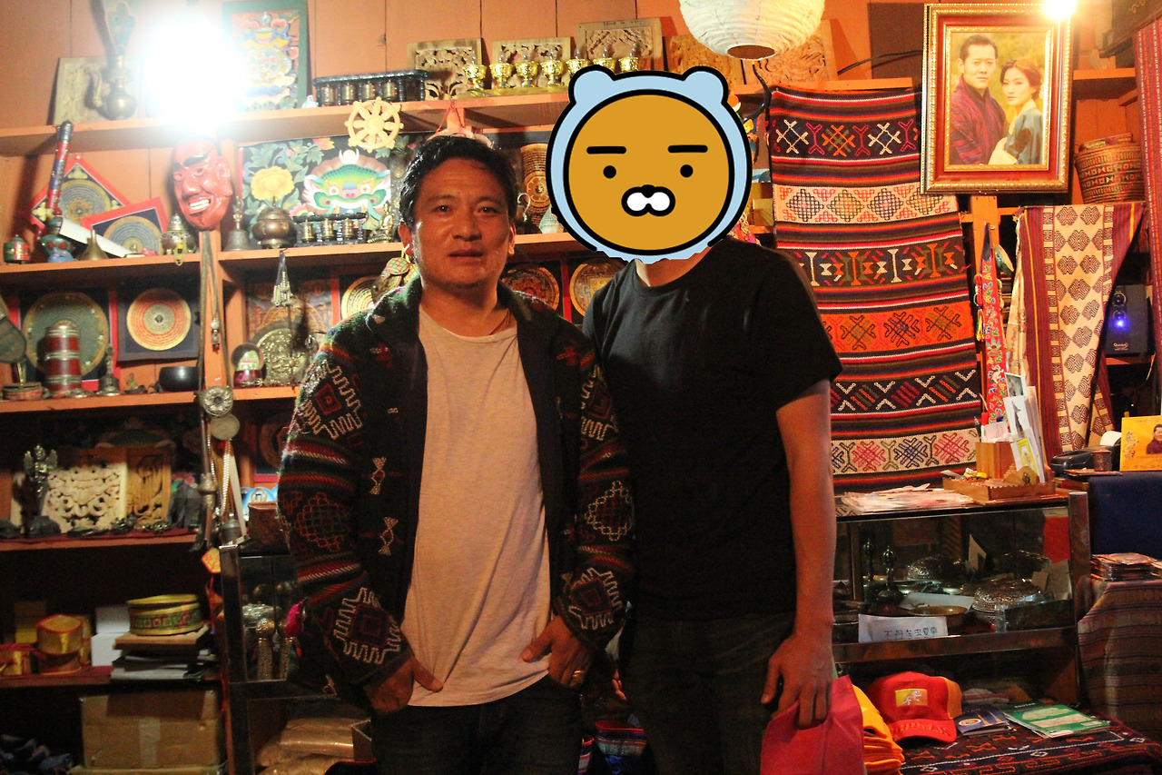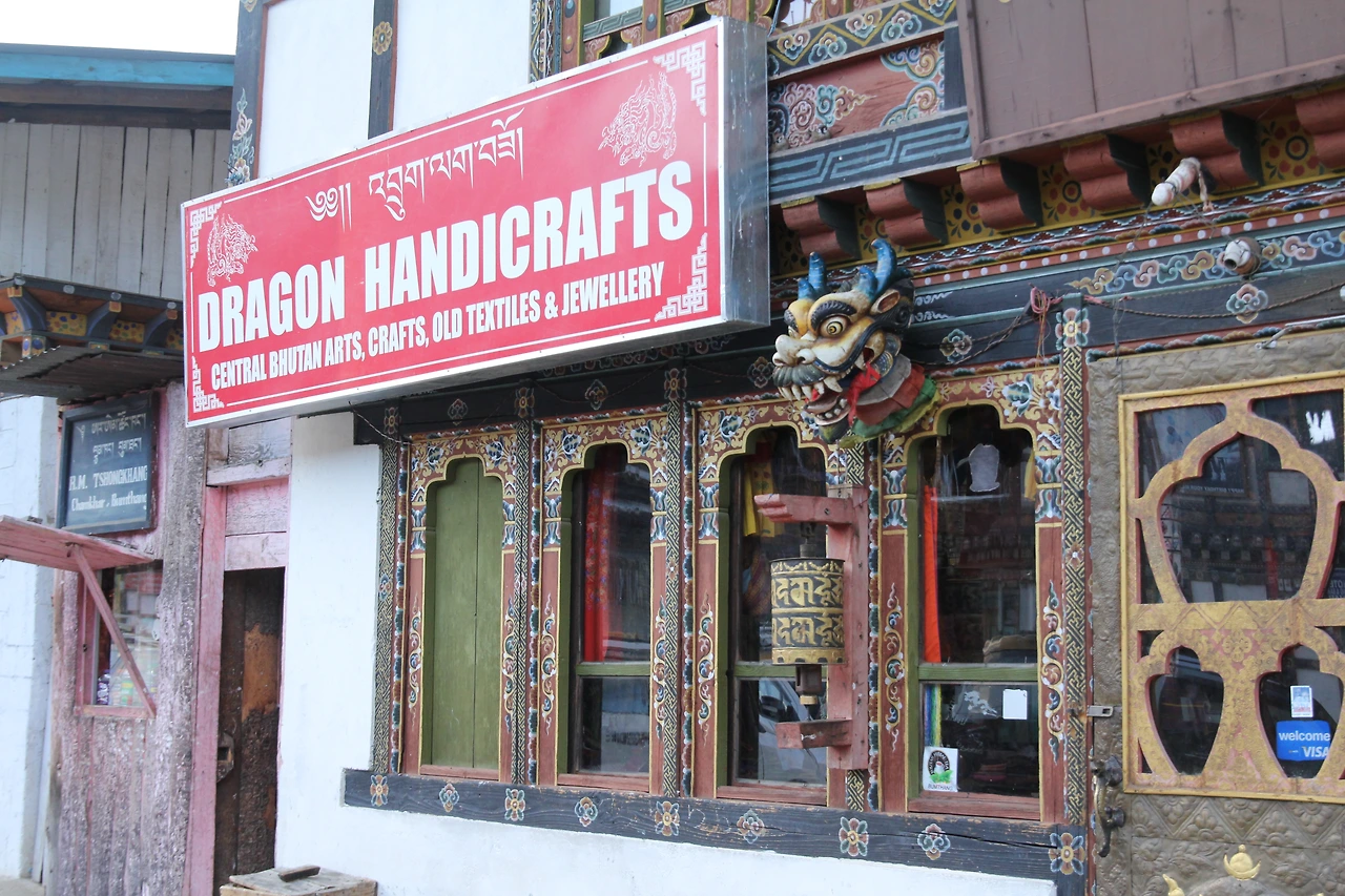 'Dragon Handicrafts'라는 간판을 건 가게로 들어서니, 지금까지 봐왔던 부탄의 수공예품과 더불어 트렌디한 기념품들도 눈에 띈다. 부탄의 우표들을 모은 책, 부탄의 명소들을 손으로 직접 그린 엽서, 고(Gho)나 키라(Kira)를 입고 있는 조그만 인형들. 친절한 주인아저씨는 카메라를 들고 다니는 나에게 마음껏 사진을 찍으며 구경하라고 말한다. 나를 데리고 자물쇠로 잠긴 진열장을 열더니, 부탄의 초대 왕이 입었던 고(Gho)를 보여주기도 한다. 상상하기도 싫은 도로 공사 때문에 붐탕까지 찾아오는 외국인들을 보기가 힘들다고 불평하면서 나에 대해 이것저것 물어본다.