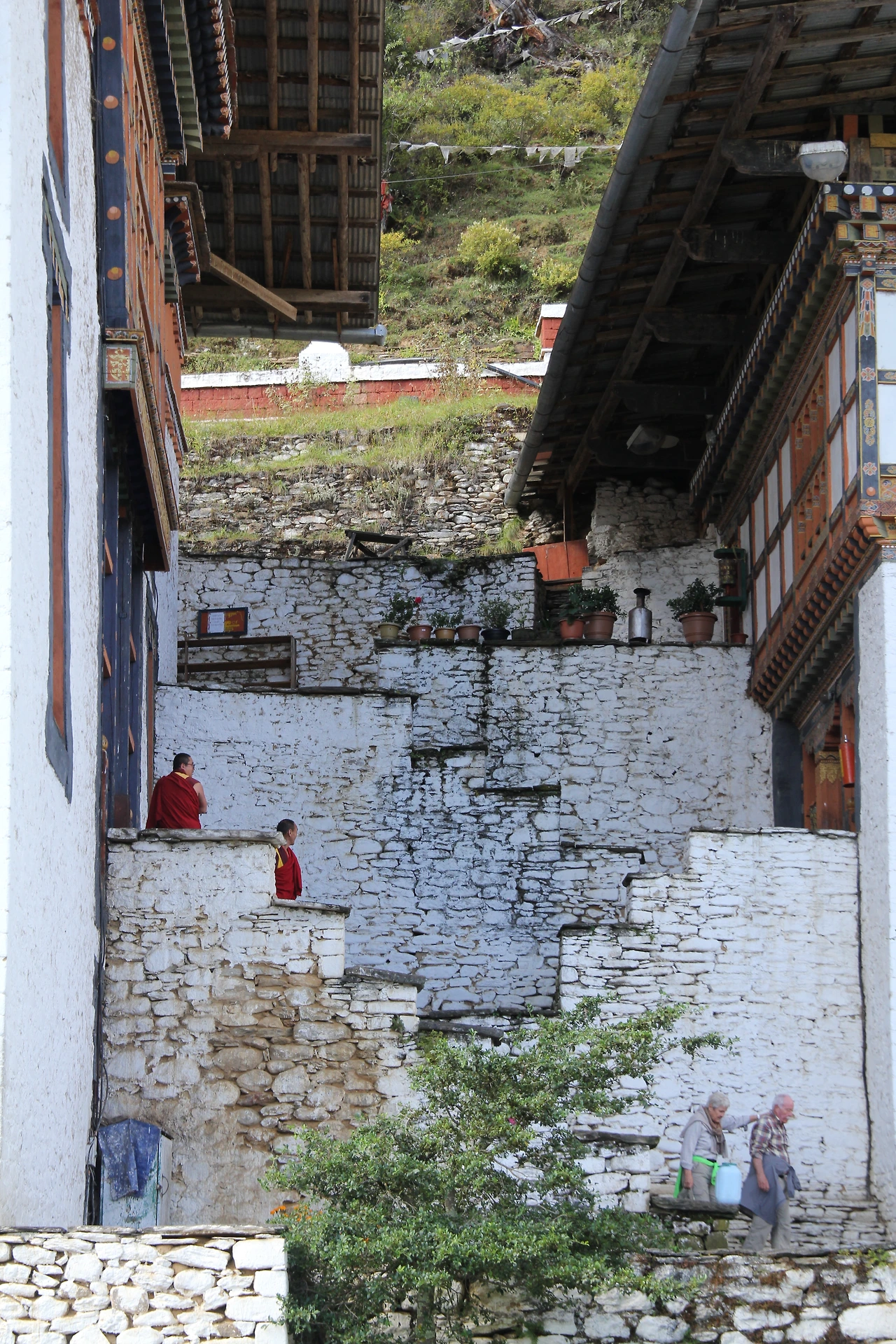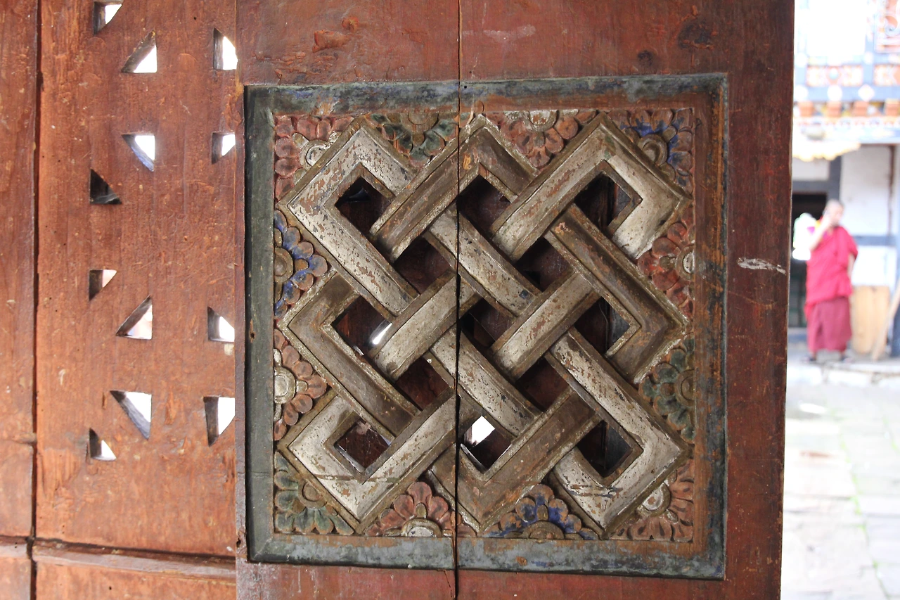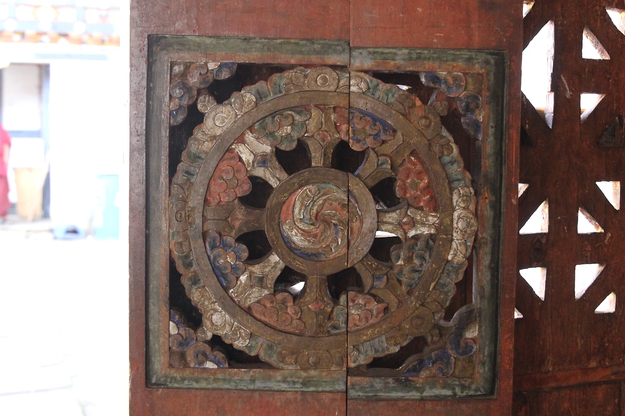 부탄 불교에서 가장 큰 종파는 겔룩빠(Gelukpa)지만, 적어도 붐탕에서는 닝마(Nyingma) 종파가 대세다. 닝마를 창시하고 이끈 뻬마 링파가 붐탕 출신이라 그런지, 타지방에선 보기 힘든 닝마 사원들을 만나기가 어렵지 않다. 땀싱 굄바(Tamshing Goemba)는 붐탕 계곡을 포함한 부탄 전역을 대표하는 닝마 사원이다. 1510년에 뻬마 링파 (Pema Lingpa)에 의해 지어졌으며, 오래된 건물 내부엔 수많은 불상들과 보물들이 봉안되어 있다. 닝마 사원이라 그런지 생김새도 예사롭지 않다. 정문으로 들어가면 스님들의 거주처가 있는 마당이 보이고, 마당 뒤편으로 일반적인 모습과 다른 이층 사원이 보인다. 절은 외벽과 구별 없이 이어진 형태로 되어있으며, 돌을 쌓아 만든 벽 군데군데 심어진 붉은 돌은 종카(dzongkha, 부탄에서 쓰이는 주 언어)가 쓰여 있어 더없이 친근하다.