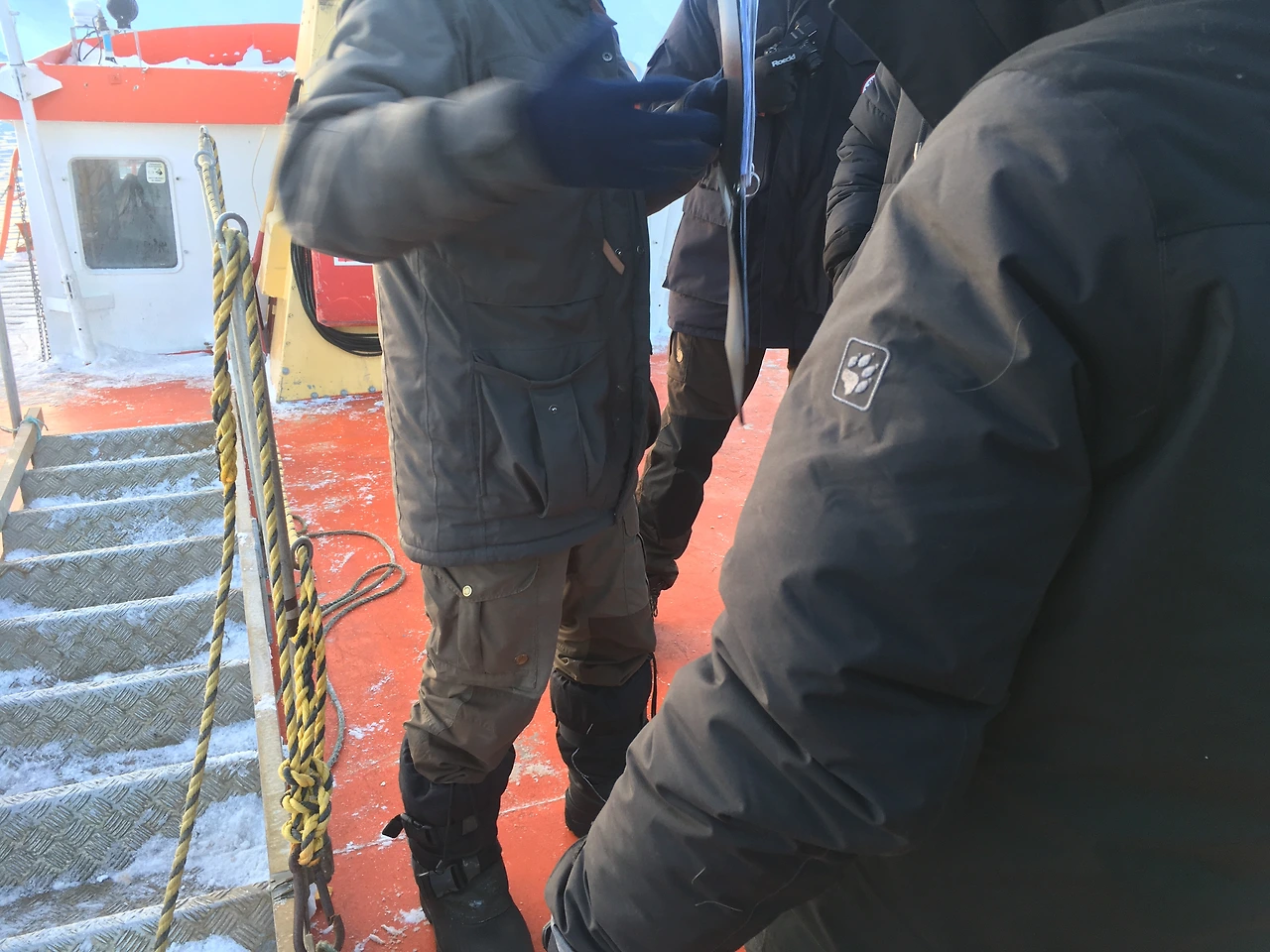빙하투어 당일, 여행사에서 집합 후 차를 타고 5분 거리에 있는 항구에 도착하였다. 배 사진을 찍지 못했지만 2층 크기의 배였는데 탑승 후 걱정거리가 이만저만이 아니었다. 먼저 2층에서 1층으로 사다리를 타고 내려가야 했는데 갑판 위가 얼어서 엄청나게 미끄러웠다. 난간이 있긴 했지만 넘어지면 그대로 미끄러져 바닷속으로 입수가 가능한, 그야말로 물아일체를 이룰 수 있던 곳이었다. 사다리쪽으로 겨우 움직여 조심조심 내려가다 앞선 친구의 머리를 밟는 실수도 잠깐 하였지만 너그러이 용서를 받았다. 배 안에서 간단한 안전교육을 받았는데 역시 추위의 나라이다 보니 구명조끼가 아닌 몸 전체로 입는 점프슈트 구명복 사용법에 대해 배울 수 있었다. 그렇게 배가 출발한 후 제공되는 따뜻한 커피와 차를 마시며 빙하들 사이로 향했다.