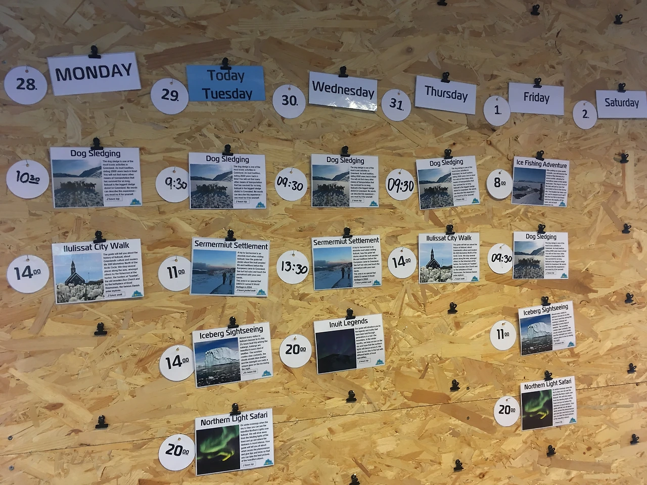 들어가자마자 벽에 보이는 해당 주의 스케줄. 한눈에 볼 수 있게 투어들이 촤르륵 정리되어 있었다. 인터넷에서도 예약을 할 수 있지만 현장과 시간이 조금 다른 부분이 있었기에 현장에서 직접 정보를 얻는 것이 더 확실했다. 이 맘 때 가능했던 활동들은 개썰매, 오로라 투어, 빙하 보트 투어, 스노 모빌, 얼음낚시, 도시 투어, 문화체험 등이었다. 그중 Northern light Safari와 Iceberg Sightseeing 두 개를 선택하여 진행을 하였고 빙하투어가 먼저 진행되었다.