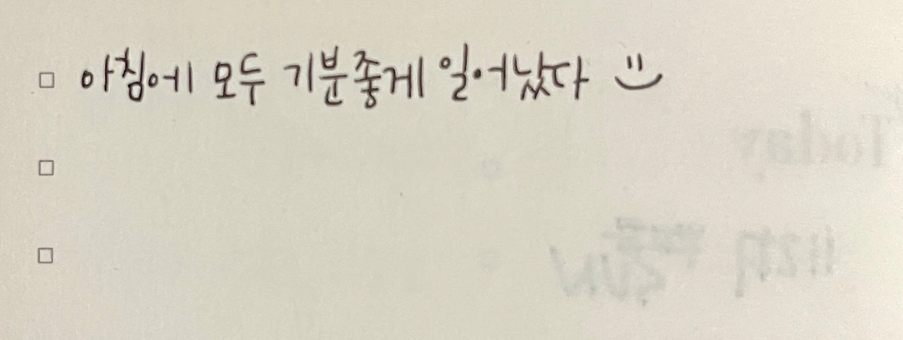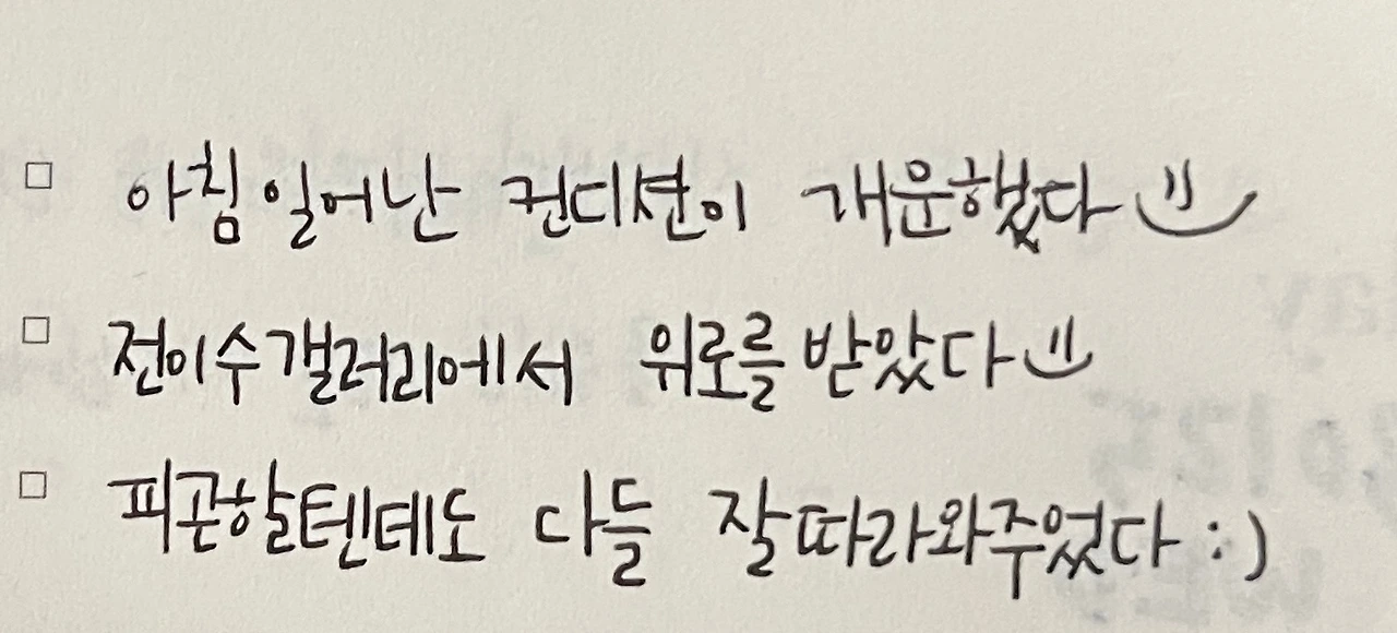 그 말을 듣고 조금 더 진심으로 나를 바라봐야지 마음을 다잡으면, 꼭 하는 일이 있다. 바로 '감사한 일' 적기. 그 감사한 일을 적는 공간은 정말, 누가보면 저런걸 감사한다고? 할 정도로 소소한 일들이 많