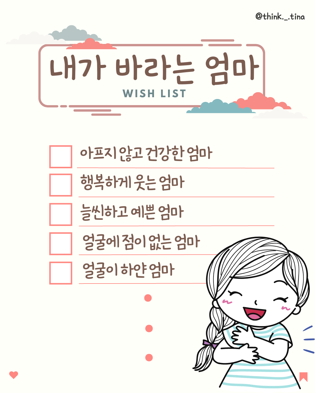 첫번째 "아프지 않고 건강한 엄마" 라는 말에 감정선이 흔들리기 시작했다. 하지만 이내 부여잡고 그다음 반짝이는 눈을 바라보며 듣는다.