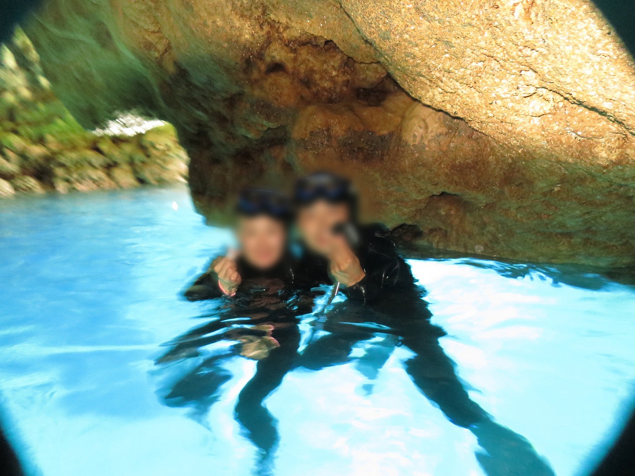 웹사이트에서는 100m만 이동하면 된다고 봤던 것 같은데, 헤엄이 서툴러서 그런지 체감상으로는 한참을 더 이동한 느낌이었다. 꽤 시간이 지나 도착한 푸른동굴은 이미 다른 업체에서 체험을 예약한 분들로 어느정도 붐비고 있었다. 우리는 그 사이에 물고기가 잘 보일만한 자리를 찾아 다녔다. 근데 문득 예약할 때부터 궁금했던 점이 생각났다. 동굴인데 어떻게 '푸른'이라는 수식어가 붙을 수 있지? 내가 갔던 동굴은 웬만하면 다 어둡고 까맣던데.