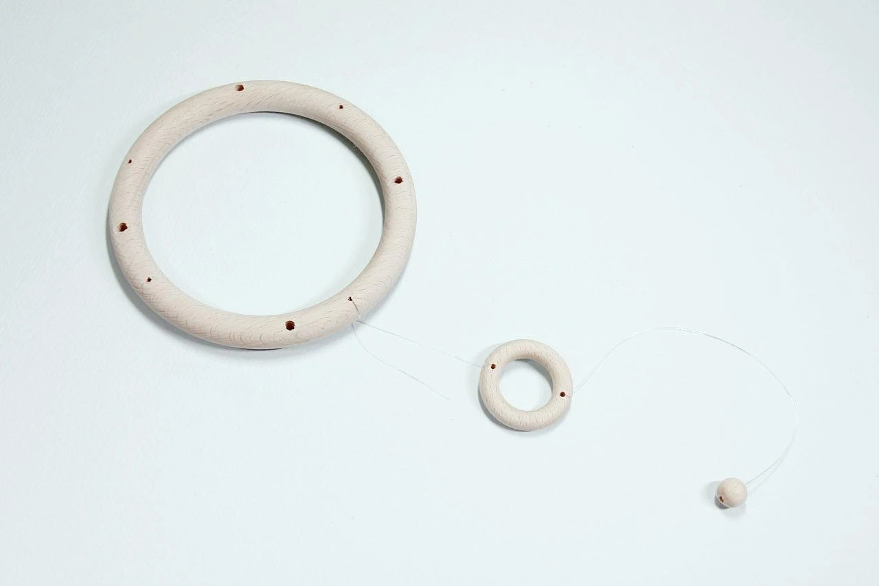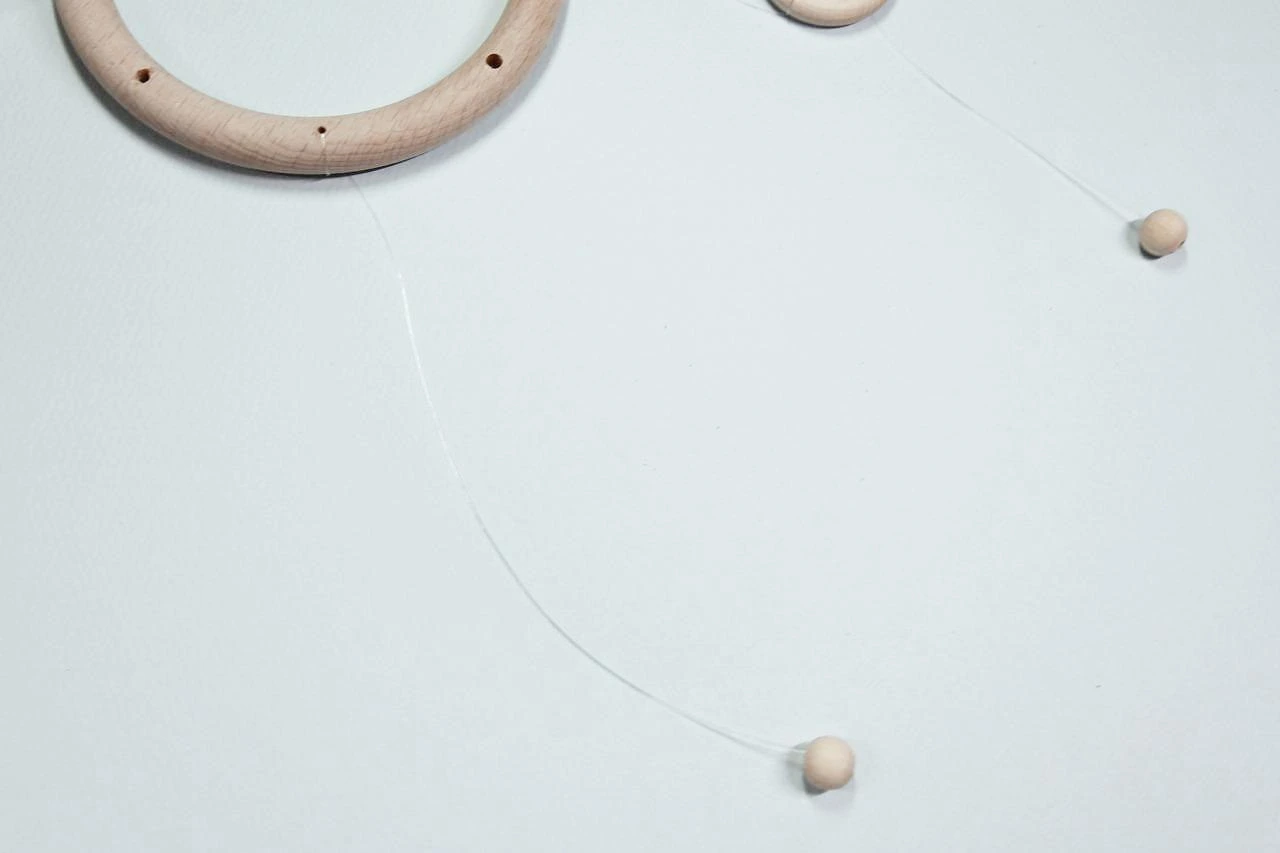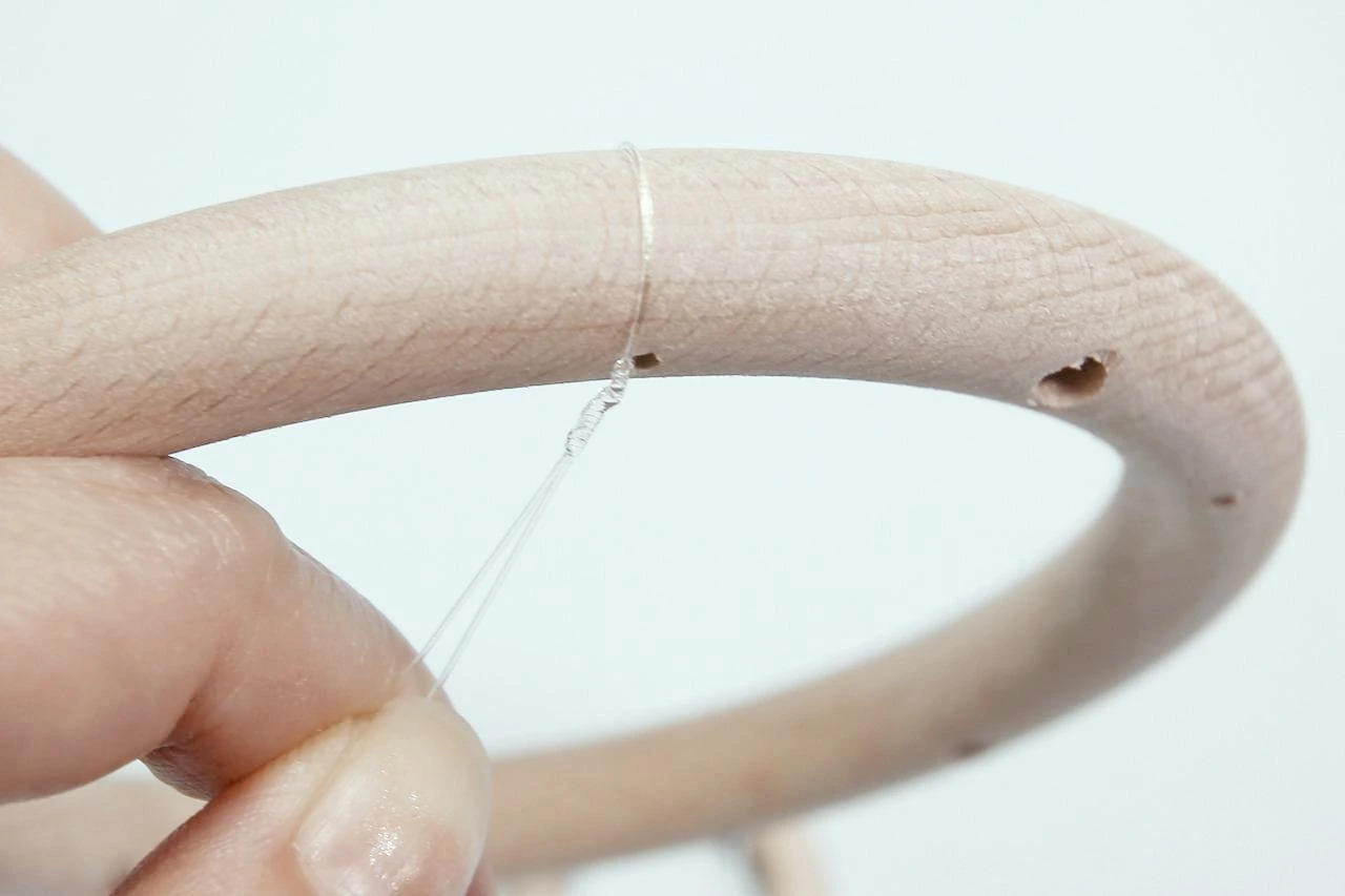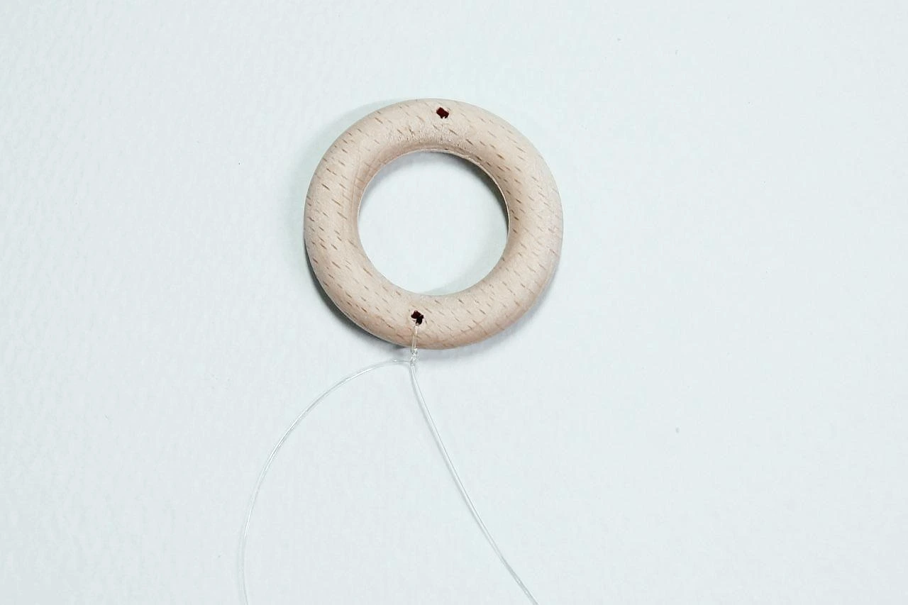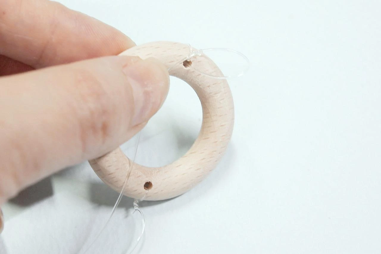 13 우레탄사와 연결한 우드 방울을 큰 우드링의 남은 구멍 2개에 매듭 지어 연결해요.