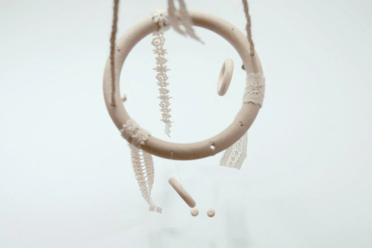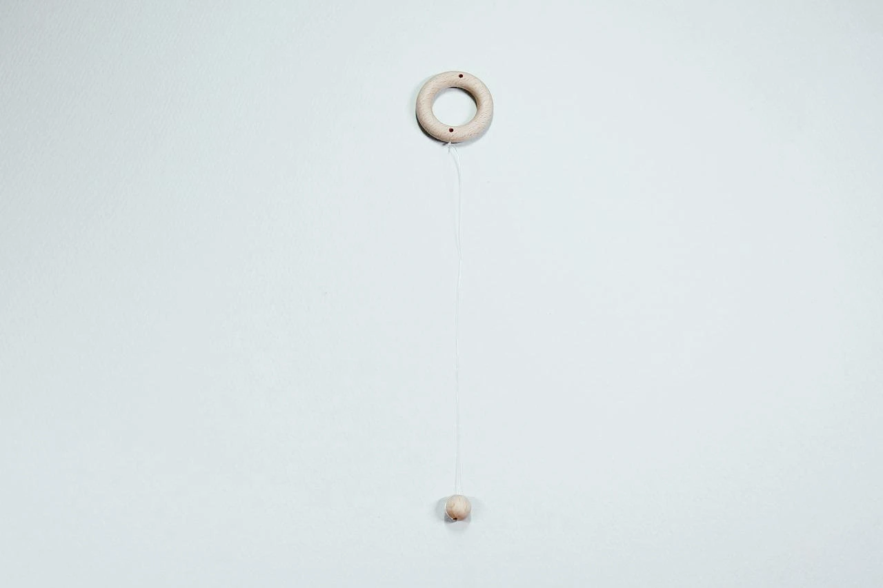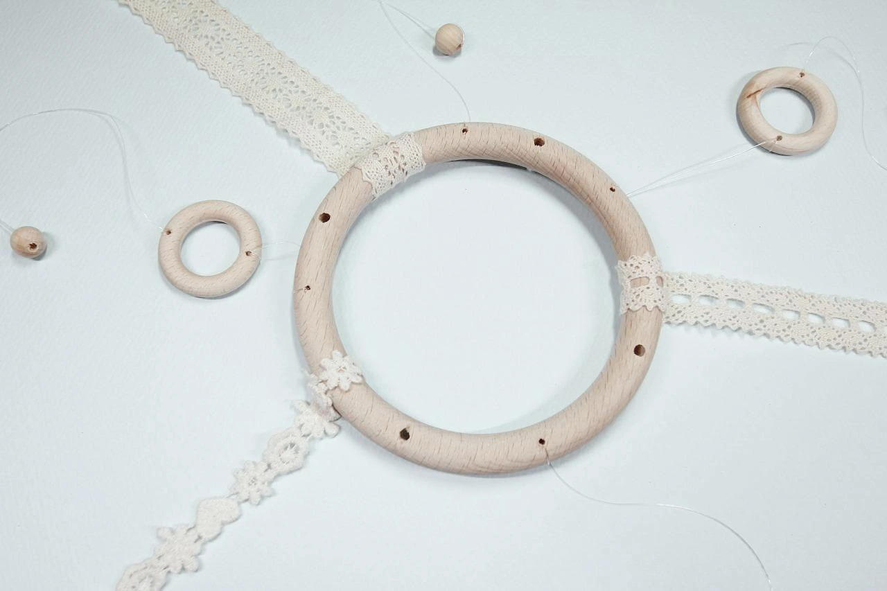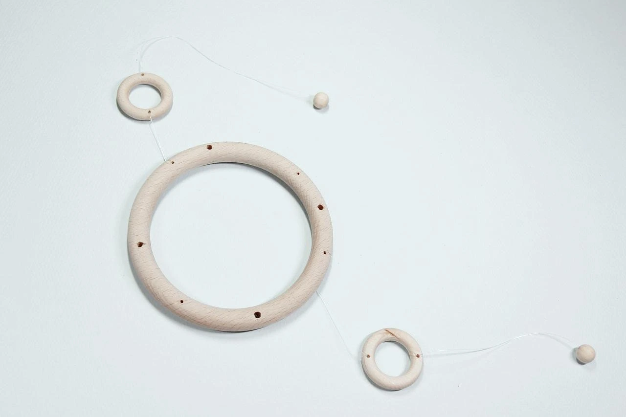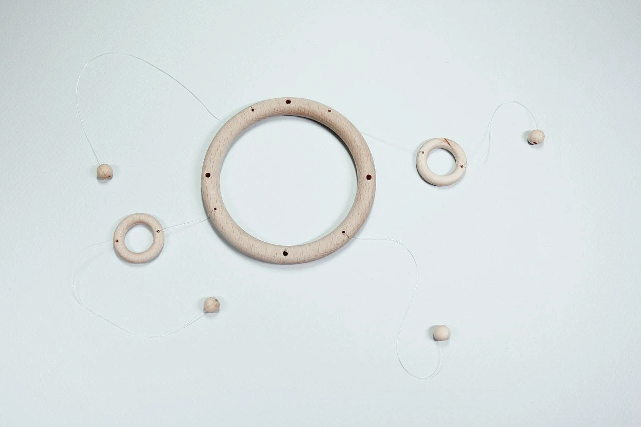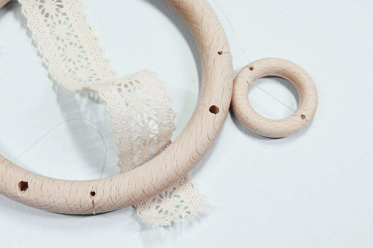 13 우레탄사와 연결한 우드 방울을 큰 우드링의 남은 구멍 2개에 매듭 지어 연결해요.