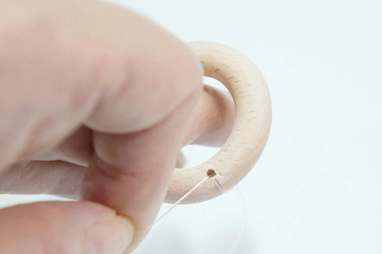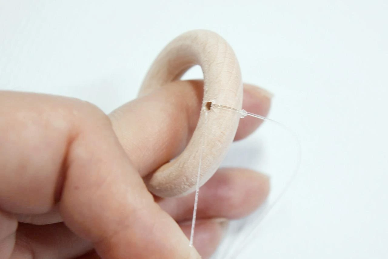 8 남은 우레탄사를 15-20cm 길이로 자른 뒤 작은 우드링의 남은 구멍에 매듭지어 연결해요.