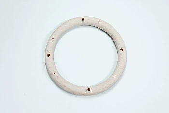 1 큰 우드링에 드릴을 사용해 마끈이 들어갈 정도의 구멍 4개를 뚫어주세요. 뚫은 구멍과 구멍 사이에 우레탄사가 들어갈 정도의 작은 구멍 2-4개를 더 뚫어주세요.