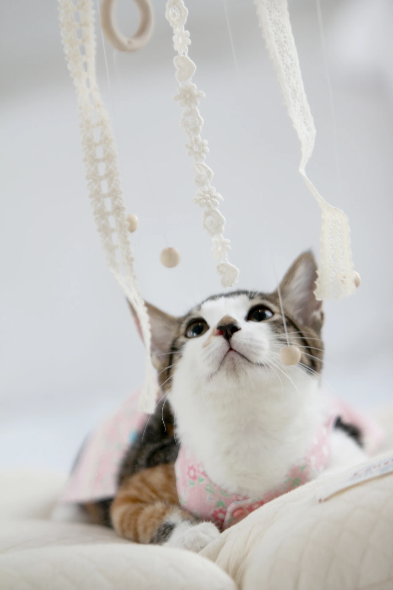 아기 고양이의 시선을 사로잡는 우드링 모빌 장난감은 우드 방울과 토숀 레이스로 장식해 부드러운 느낌을 연출해요. 살랑살랑 움직이는 모빌 장난감의 움직임이 고양이의 호기심을 자극할 거예요. 걸어놓지 않아도 낚시 놀이를 하듯 모빌을 들고 다니며 아기 고양이와 함께 당기며 놀아주세요.