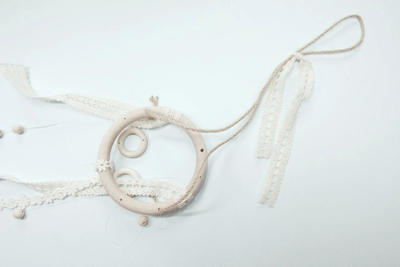 17 큰 우드링의 구멍에 마끈을 위에서 아래로 넣어 매듭 지어요. 남은 토숀 레이스 1개를 매듭 지은 마끈의 7-8cm 지점에 묶어요.