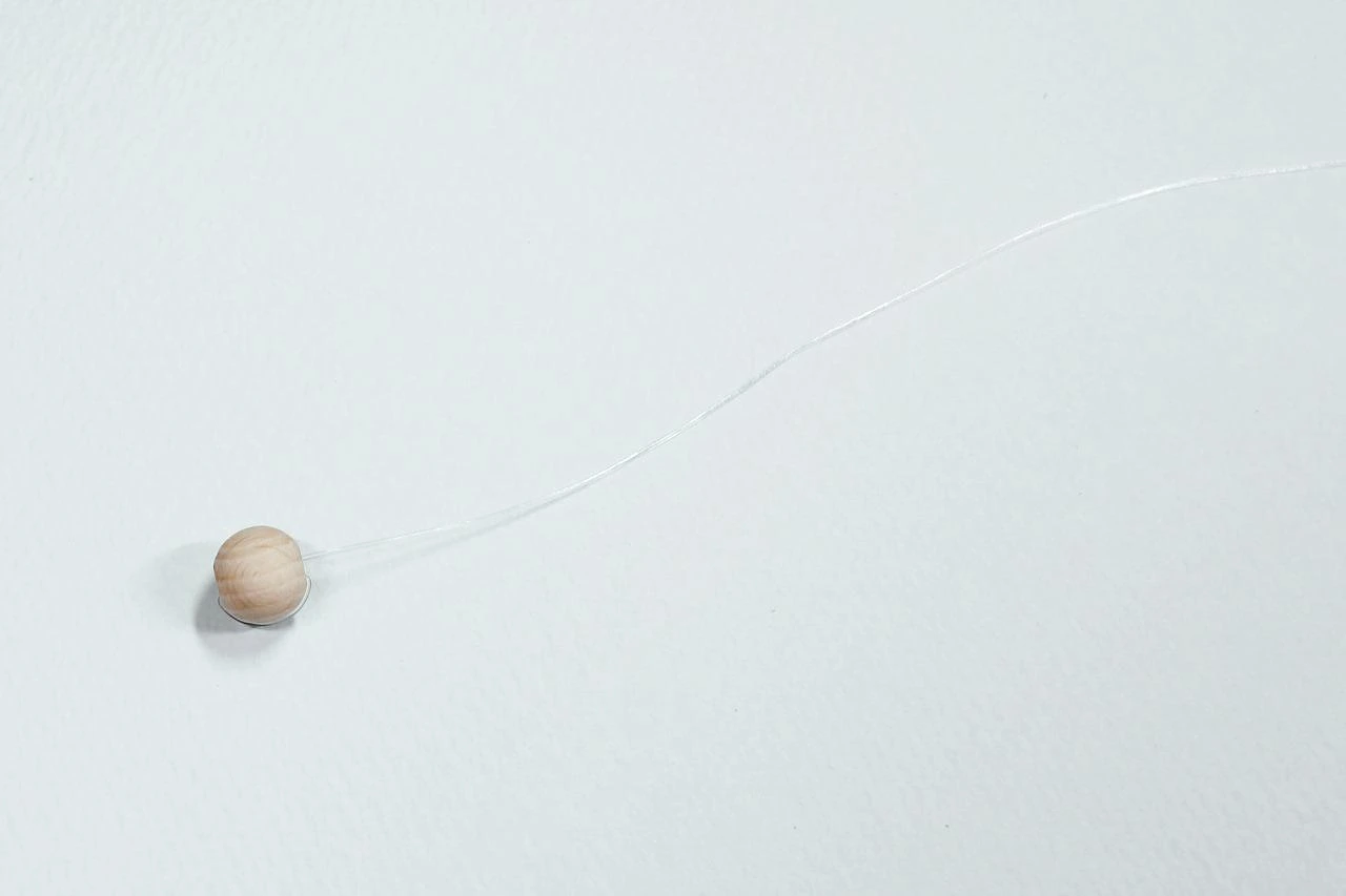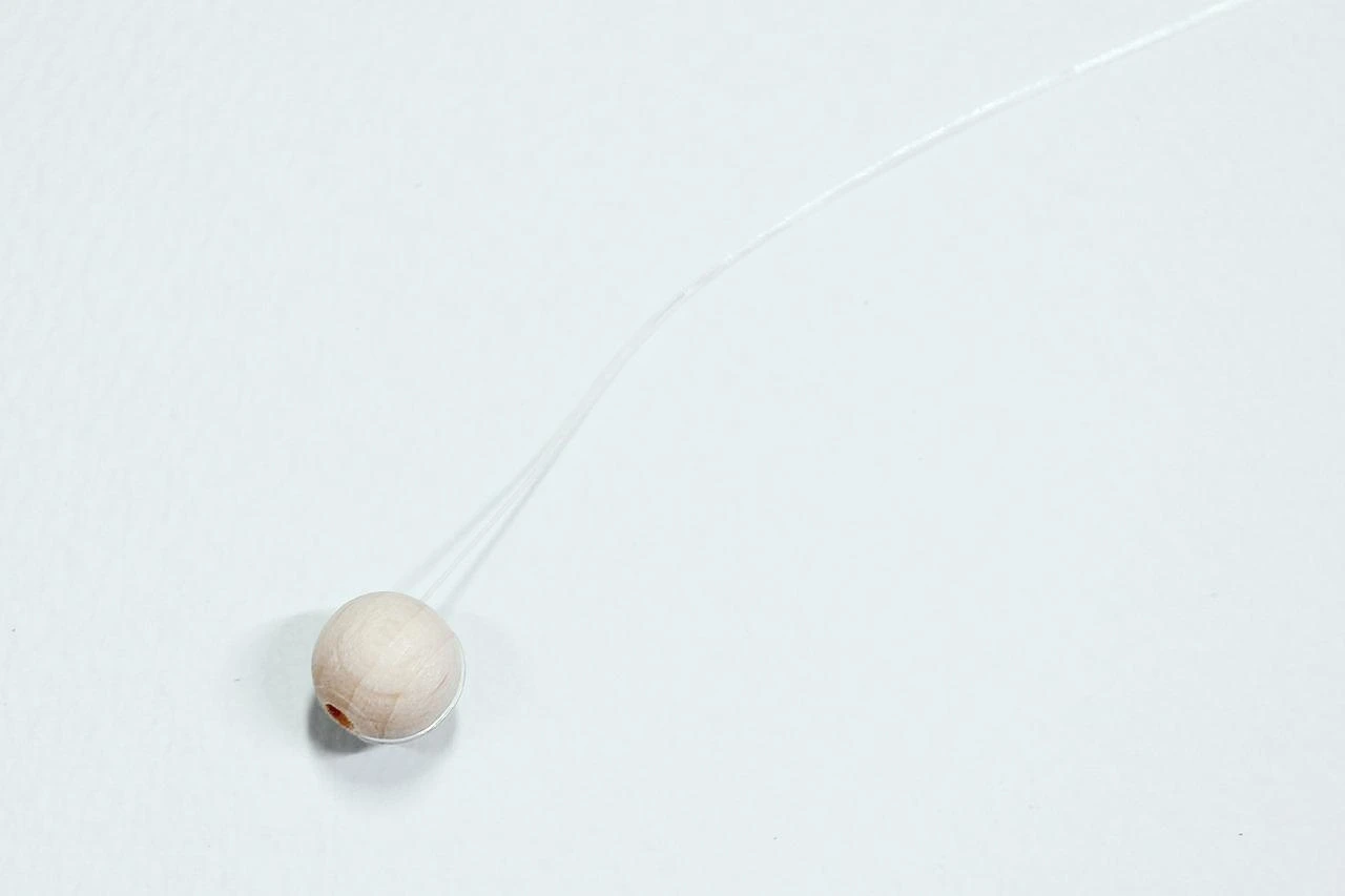 6 과정 5의 우레탄사 아래쪽에 우드 방울을 과정 3-4와 동일한 방법으로 풀리지 않게 매듭 지어 연결해요.