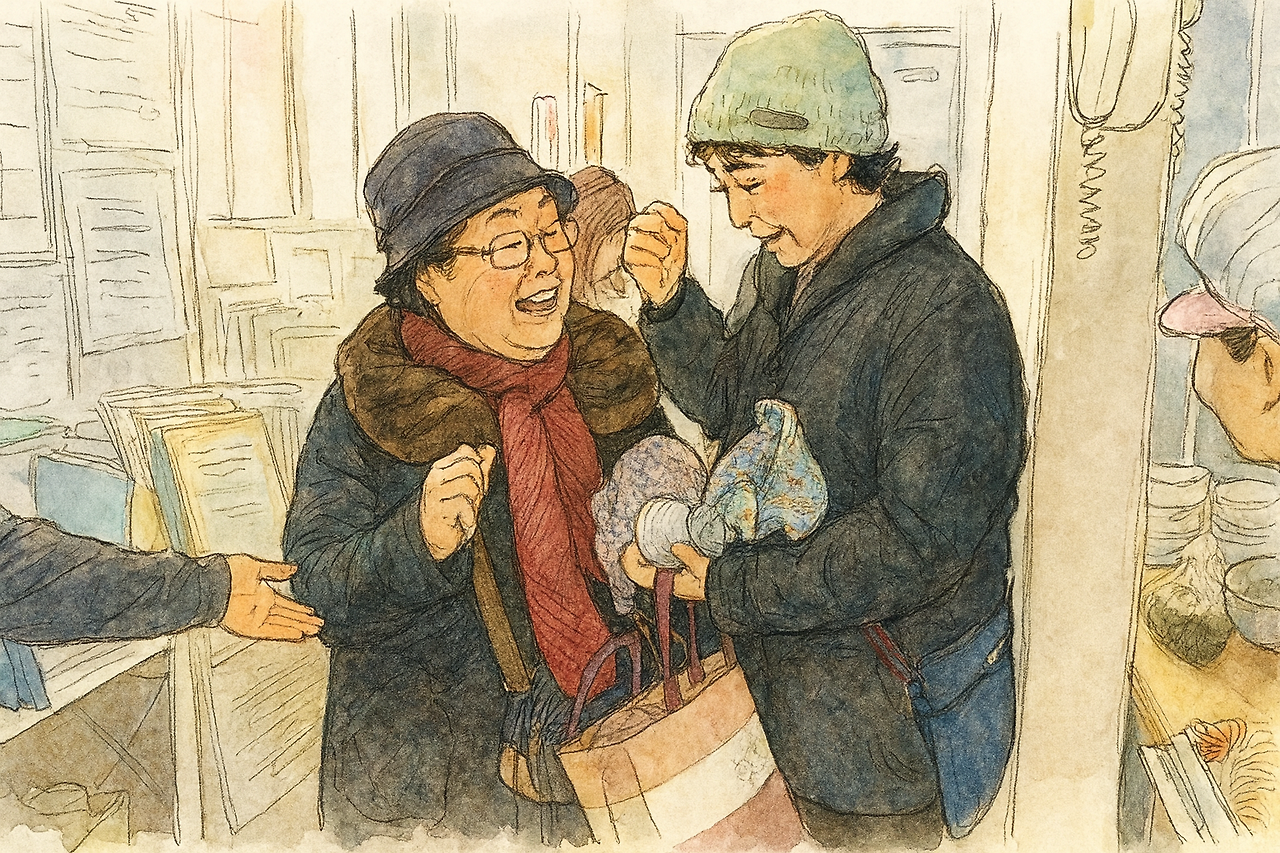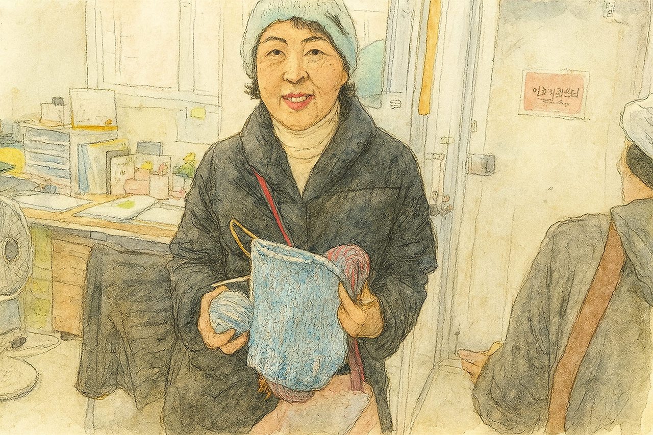 식사를 마치고 돌아가던 최계영 어르신과 김정희 어르신은 김옥희 님에게 만들어온 모자를 건네고 밑단만 뜨개질되어있는 일거리를 받으셨다.