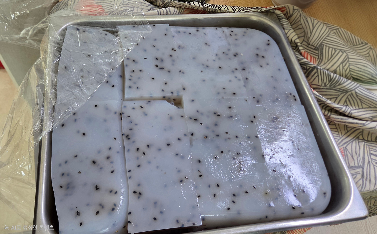 부지런히 준비하던 와중에 직접 쑨 올방개묵을 큰 쟁반에 담아 들고 온 이웃이 있었다.