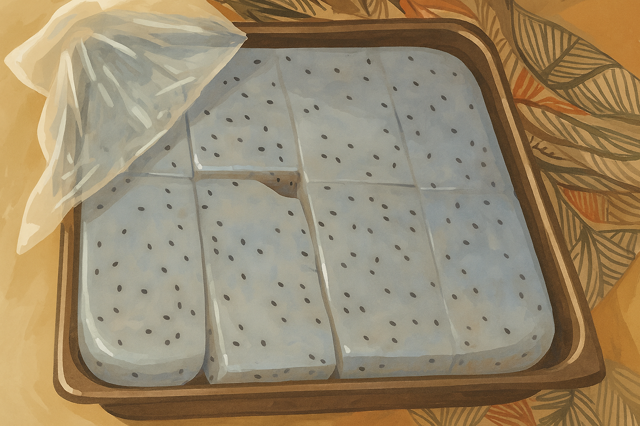 (하얀 묵에 흑임자깨가 박혀있어 마치 묵 안에 올챙이알을 풀어놓은 것 같다고 해서 올방개묵이라고 한다)