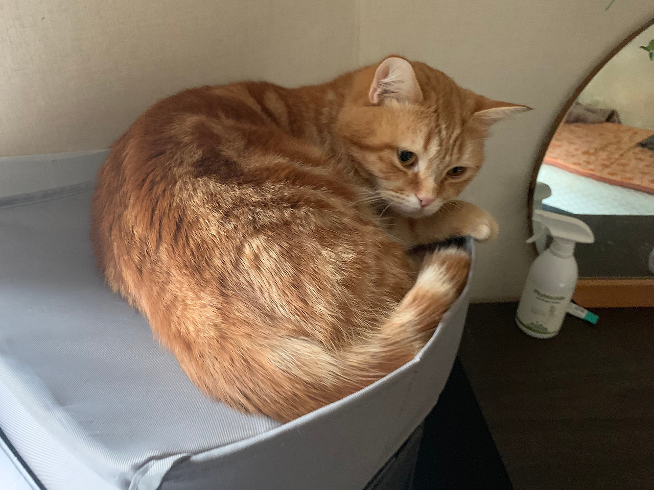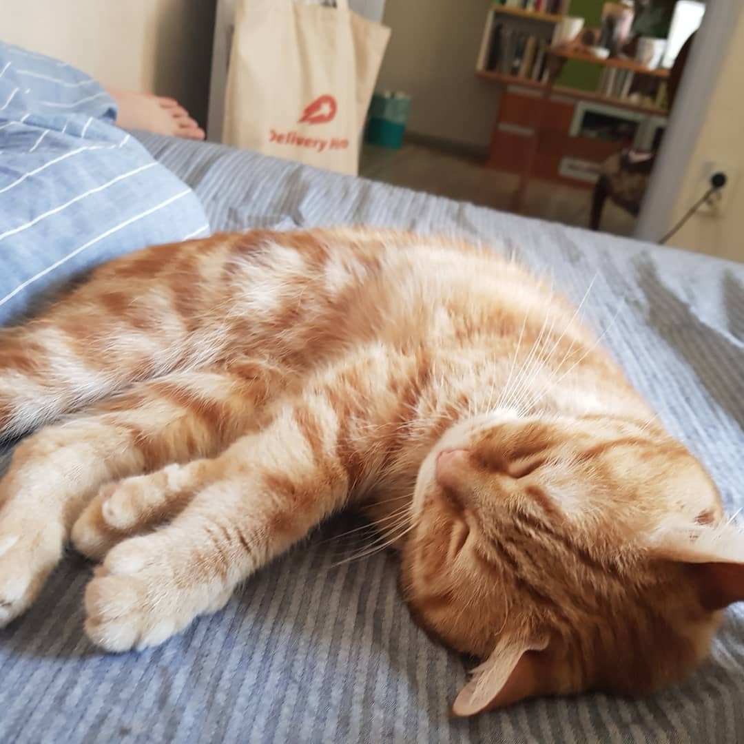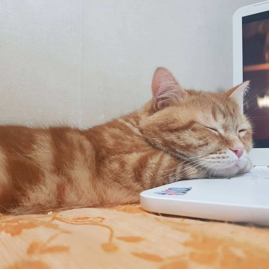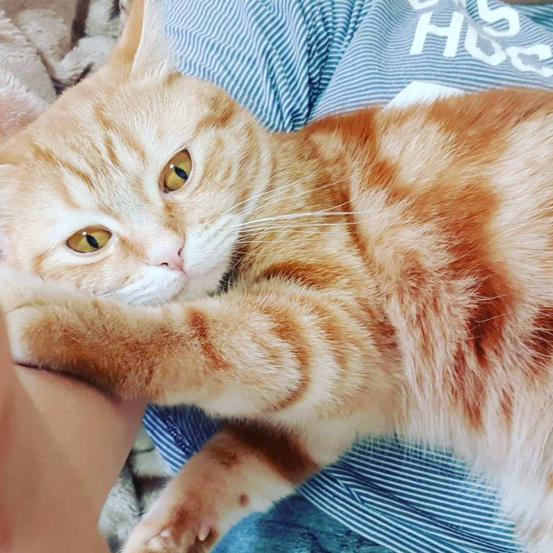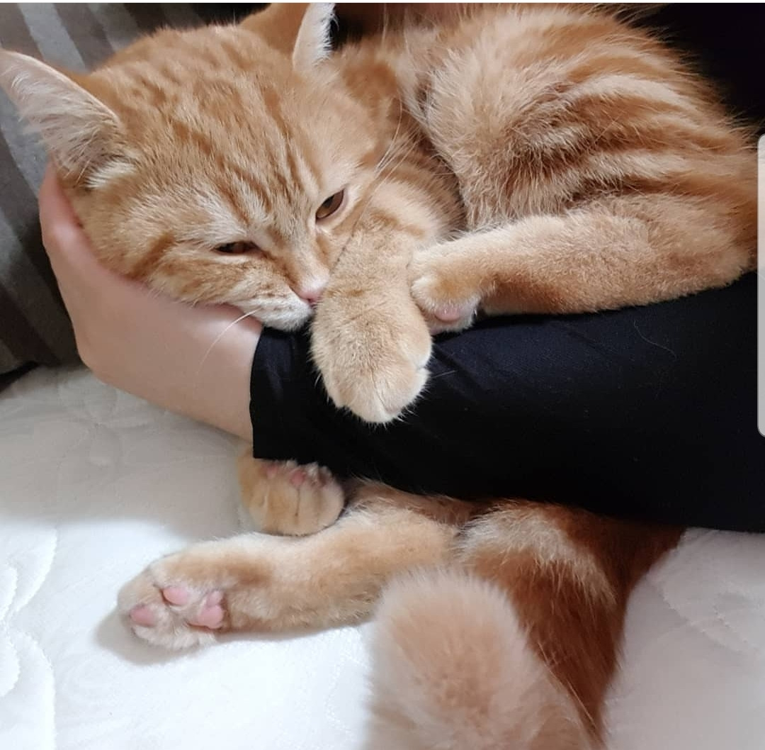 잘때도 내 다리에 등을 기대는 정도로 스킨십을 한다. 다리를 내 몸에 대고 있는 정도다. 완전히 안겨있거나 푹 감싸지는 것은 별로 안좋아하는 것 같다.