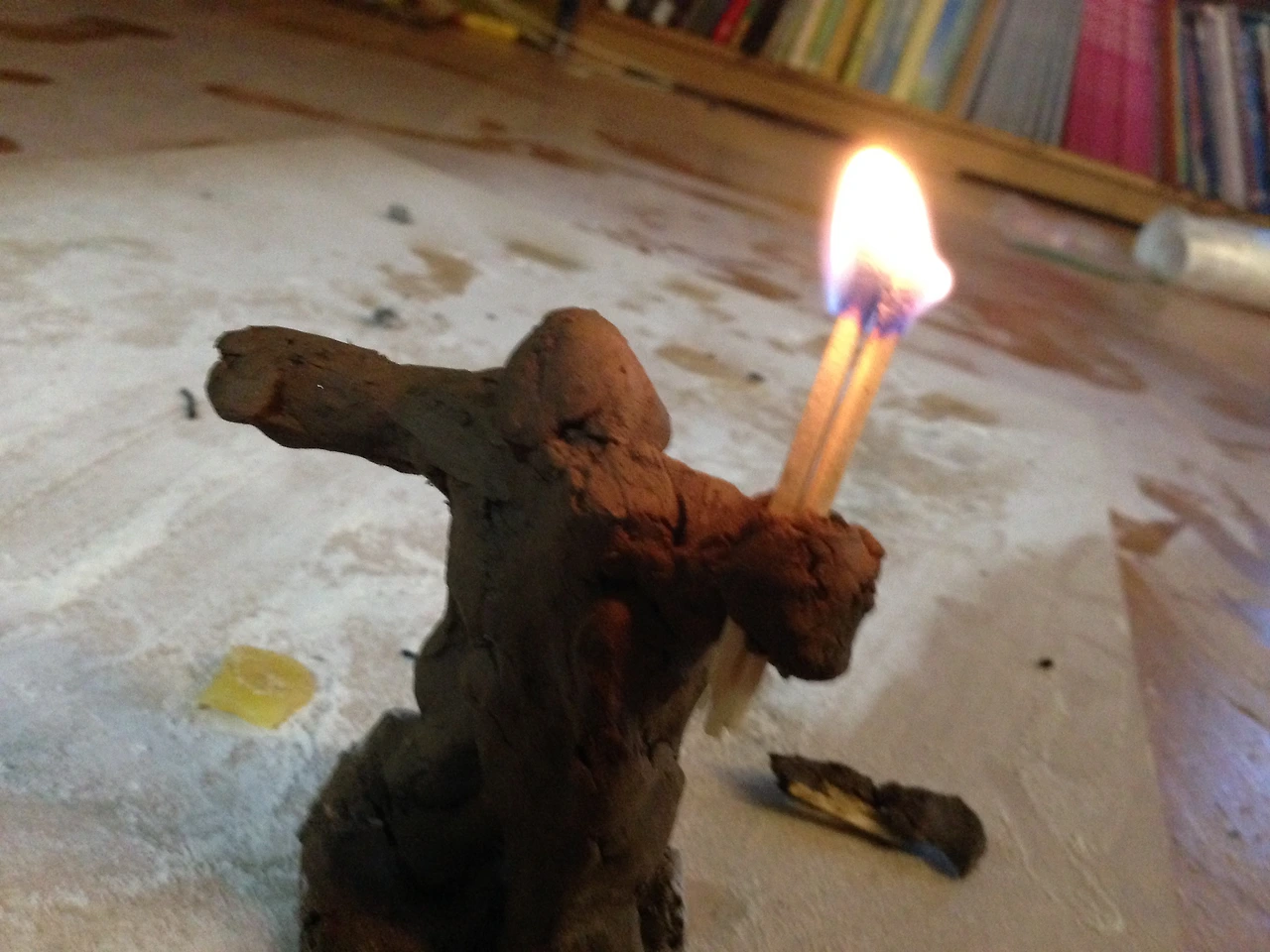 찰흙으로 조그맣게 마을을 만들고 불타는 장면을 찍겠단다.
