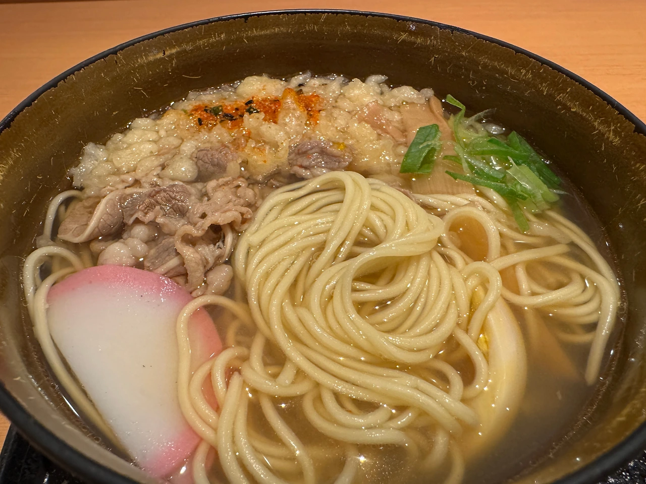 가게 내부는 촬영 금지라 음식만 찍었습니다. 제가 주문한 메뉴는 소고기를 곁들인(牛肉入り) 신오사카 소바입니다. 토핑은 약간의 파, 텐카스(天かす)가 절반을 차지하고 있고, 얇은 카마보코(かまぼこ)가 두 장, 멘마(メンマ; 죽순 조림)가 3~4개, 면 밑으로 내려가서 잘은 안보이지만 간장에 절인 반숙 계란(味玉; 아지타마), 그리고 마지막으로 규동 정도 두께의 소고기가 올라가있습니다. 시치미는 카운터에 있으니 거기서 뿌려서 오시면 됩니다. 젓가락과 수저(レンゲ; 렌게)도 카운터에 있으니 따로 챙기셔야합니다. 다 드시고 난 후에는 식기류와 트레이를 들고 반납창구에 가시면 됩니다. 가끔 자리에 방치하고 가는 사람도 있는데 이건 비매너죠.