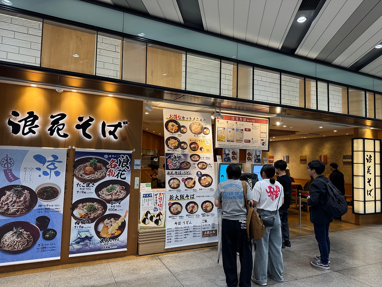 그리고 제가 누군가에게 타치구이 소바, 우동을 추천해야 한다면, 저는 오늘 소개할 나니와 소바(浪花そば)를 추천합니다. 이 가게가 체인인지 아닌지는 모르겠습니다만(같은 이름의 소바샤부집이 몇군데 있는데 같은 가게인지는 모르겠습니다), 제가 늘 가는 가게는 신오사카(新大阪)역에 있습니다. 신오사카역은 크게 3개의 구역으로 나뉘어지죠. 신칸센, 지하철 미도스지선, 마지막으로 JR재래선인데, 나니와 소바는 JR재래선 개찰구 “안”, 그것도 구석에 있습니다. 멀리서 오는 관광객이야 일본 한 번오면 뽕(?)을 뽑는다는 느낌으로 신칸센이나 비행기타면서 장거리 여행하는데 한국인은 워낙 접근성이 좋다보니 도시/권역별로 끊어오는 경향이 있어서 사실 신칸센 탈 일이 많이는 없죠. 지금도 신칸센에서 이 글을 쓰고 있는데 중국인과 서양인이 정말 많네요. 그래서 생각보다 신오사카역 JR재래선 구역은 한국인 관광객이 상대적으로 적긴합니다. 게다가 구석에 쳐박혀있고, 심지어 당장 다음 맛집 가기도 바쁜데 역에서 500엔 넘게주고 맛도 없는 우동/소바를 먹기는 좀 그렇죠.