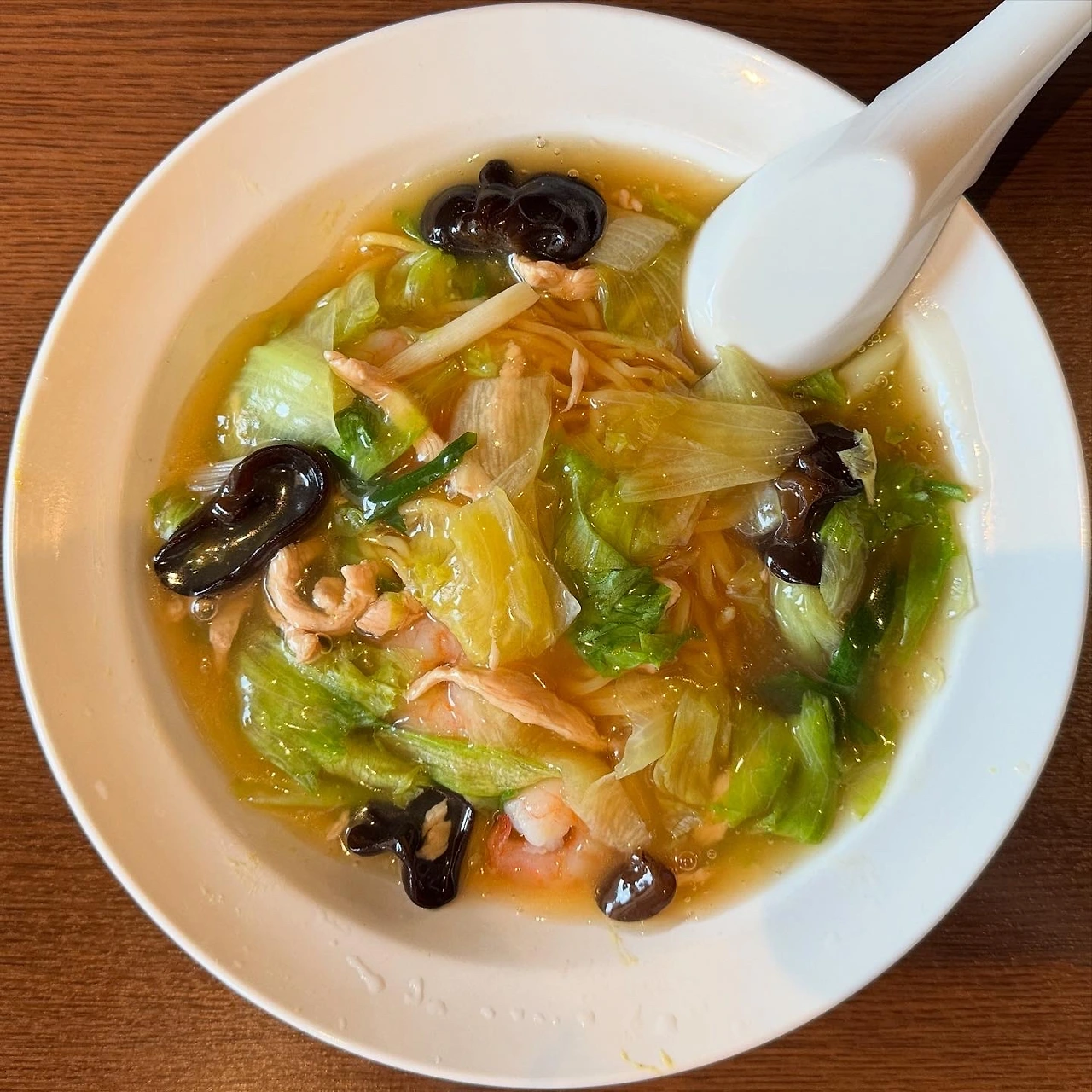 카라시소바는 맛있었습니다. 코가 찡할 정도로 겨자맛이 강하지 않고 기분 좋은 수준의 겨자향입니다. 굳이 따지자면 겨자잎과 비슷한 수준이 아닐까 싶네요. 면은 스트레이트 중화면이고 간도 짜지 않고 딱 좋았습니다 (싱겁지는 않습니다). 후반에는 식초를 한 바퀴 둘러서 먹었는데 이것 또한 괜찮더군요. 앙에는 새우, 목이버섯, 양상추가 듬뿍 들어있고 잡채용 돼지고기가 중간중간 씹힙니다.