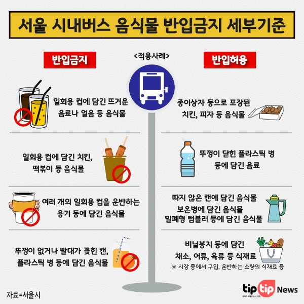 서울시가 「서울특별시 시내버스 재정지원 및 안전 운행기준에 관한 조례」일부 개정으로 지난 1월 4일부터 서울 시내버스 내 음식물 반입이 제한이 시행된 가운데, 서울시가 세부기준을 마련해 운전자 교육과 홍보에 나섰다.