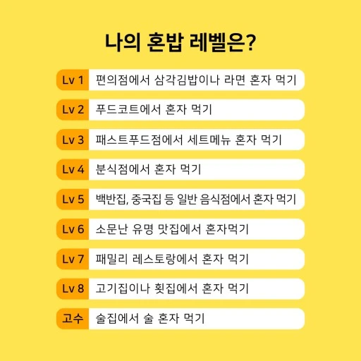 몇 년 동안의 혼밥 경험으로 나의 혼밥 레벨은 5단계까지 상승했다. 웬만한 식당에선 혼밥이 어렵지 않게 됐다. 그래도 6단계인 맛집은 가족, 친구와 함께 하고 싶다. 맛있는 음식은 사랑하는 사람들과 함께.
