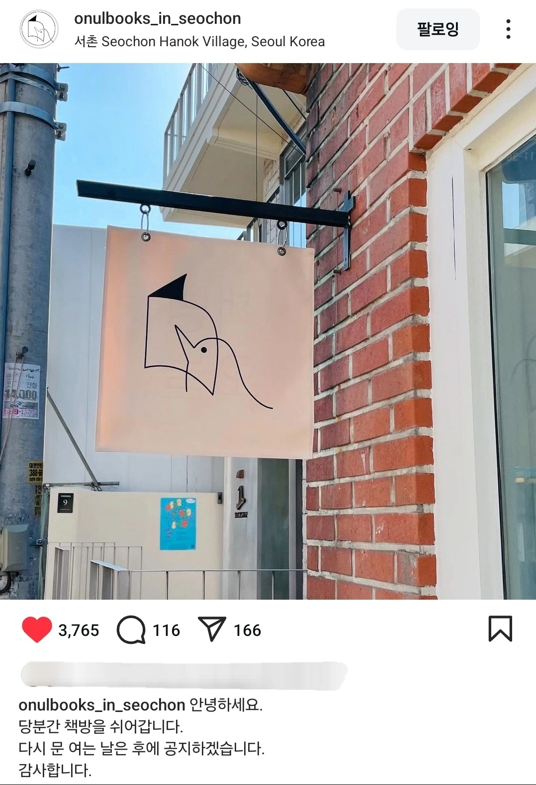 한강 작가가 운영하는 동네서점인 <책방오늘>은 '당분간 책방을 쉬어갑니다'는 휴점 소식을 알려왔다.