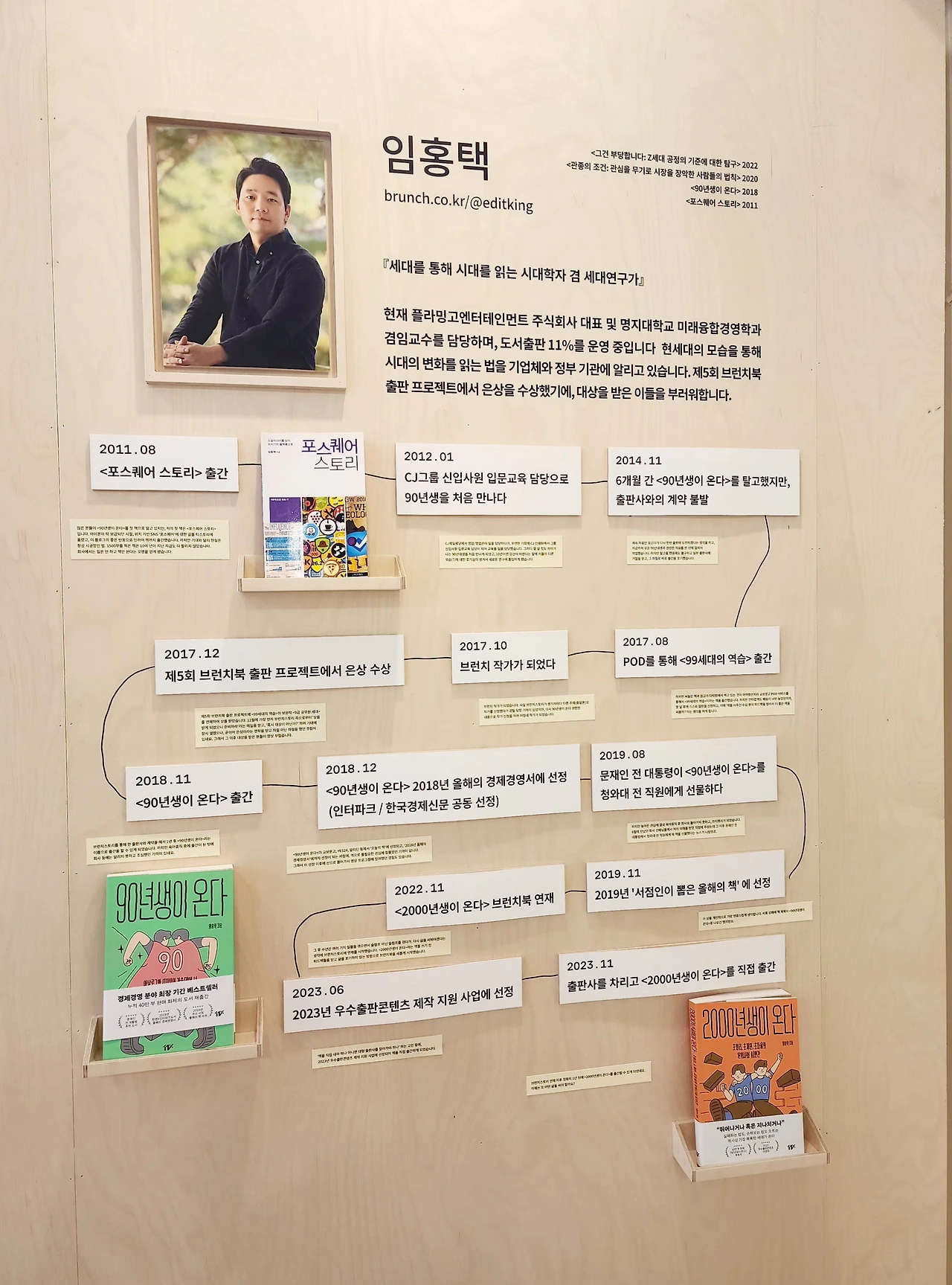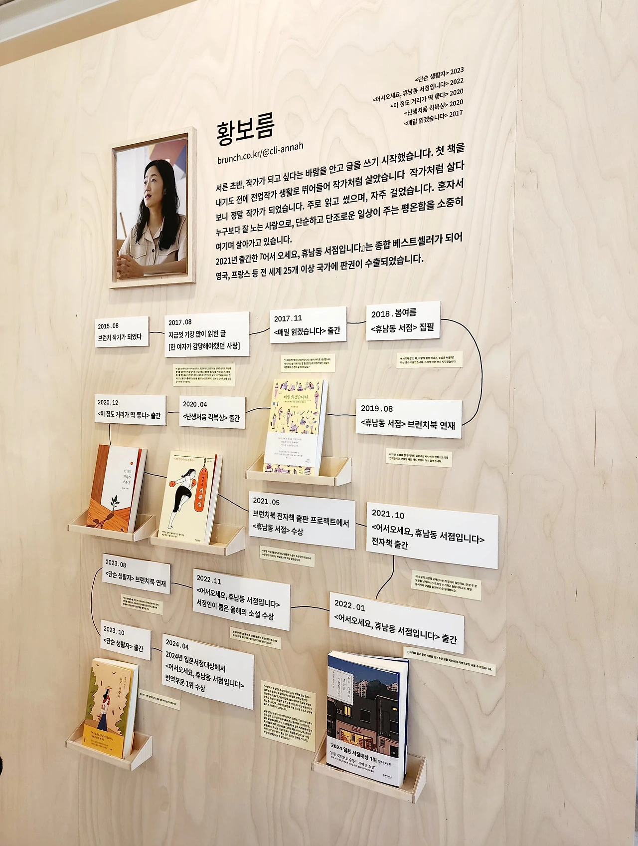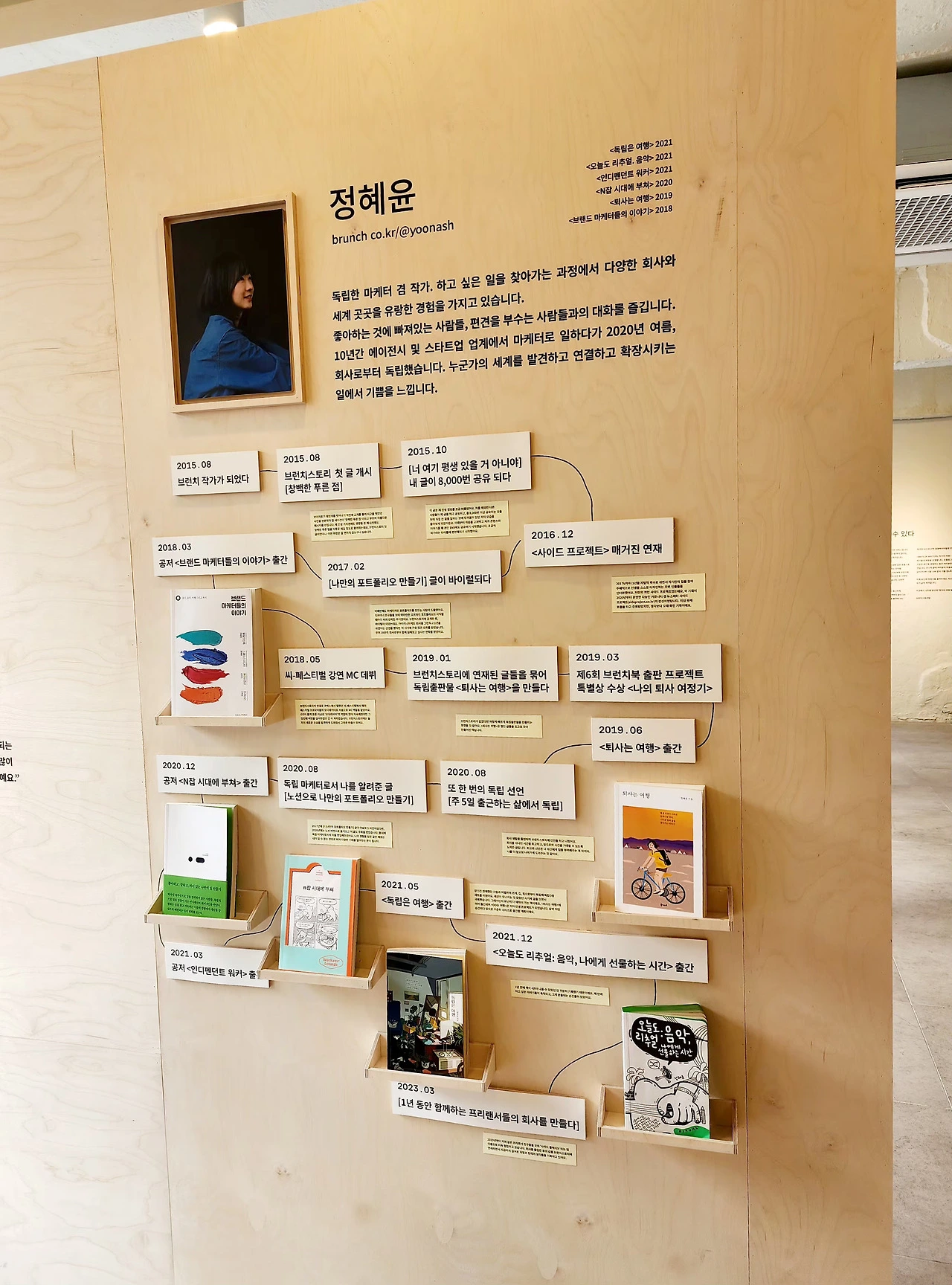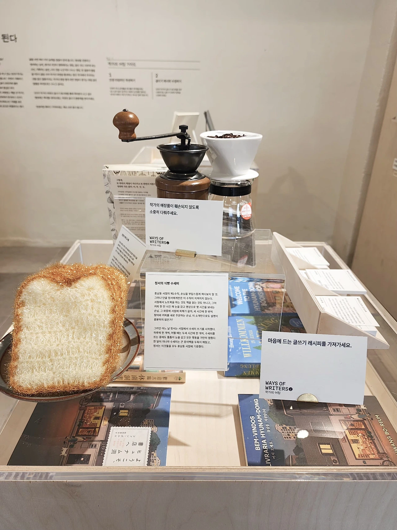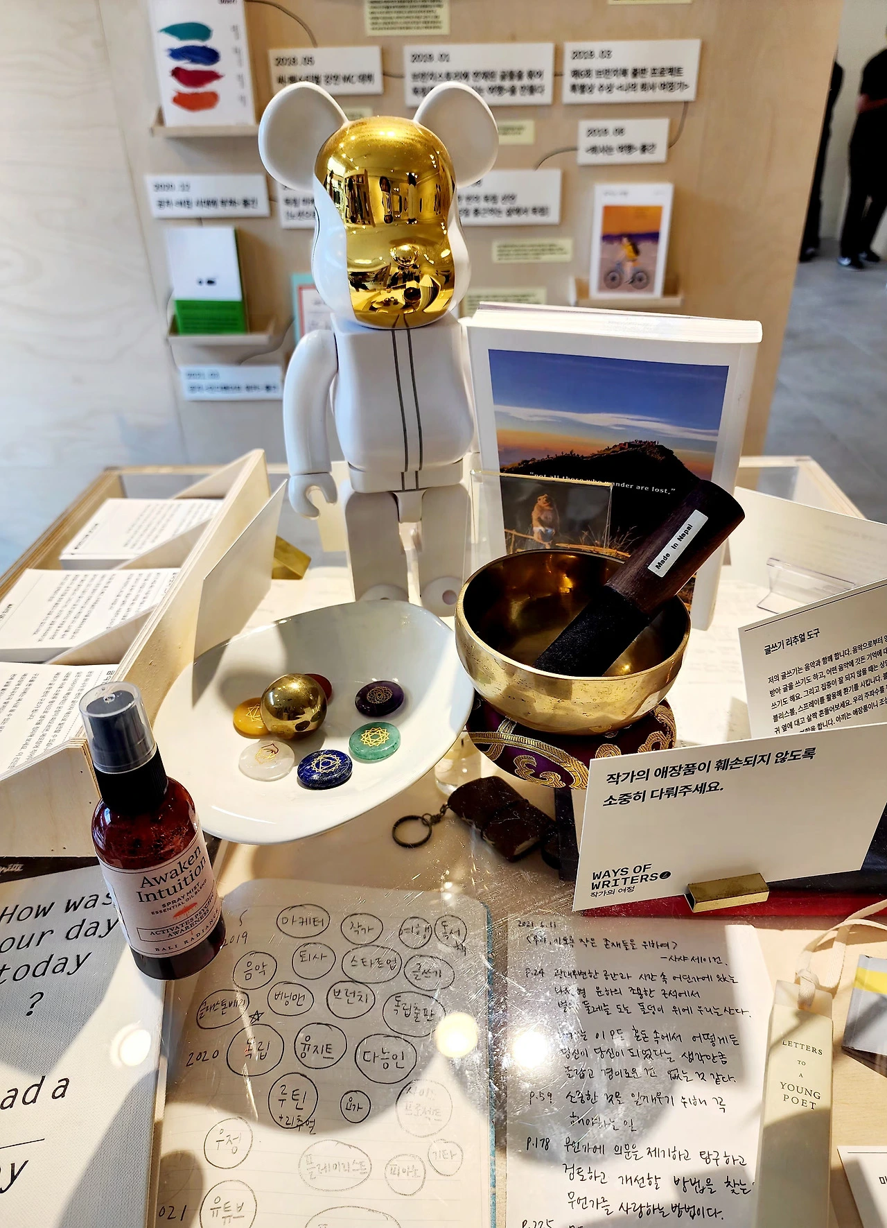 정문정, 임홍택, 윤수훈, 황보름, 정혜윤 작가님이 작가가 된 과정 그리고 함께 했던 물건들이 전시되어 있다. 커피, 싱잉볼, 라디오 등 소품도 다양했지만 다섯 분의 작가님의 공통점을 찾을 수 있었다.