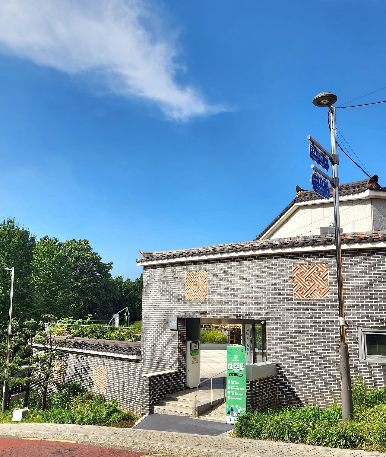 한옥 옥외마당 관중석인 계단형 독서 쉼터 위로 삼색 캐노피가 설치되어 있다. 화사한 삼색 캐노피는 낮에는 뜨거운 햇볕을 막아주고 밤엔 조명 빛을 받아 이색적인 공간이 된다. 햇볕을 받은 캐노피도 멋졌지만 밤에 더 근사할 거 같았다.