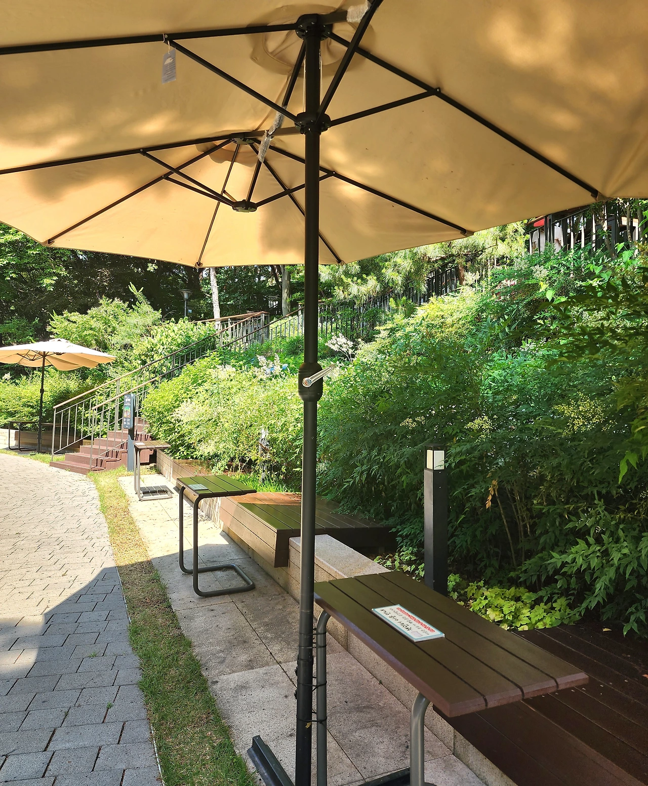 나무와 파라솔이 만들어 준 그늘에 앉아 숲속 향을 맡으며 독서를 할 수 있다. 솔솔 불어오는 산바람이 독서력도 향상시키지만 편안한 수면을 유발하기도 하는 듯하다. 편안한 의자에 앉아 책을 읽다 책을 얼굴에 덮은 채 달콤한 낮잠을 즐기는 분도 있었다. 이곳에서만 누릴 수 있는 호사가 아닐까.
