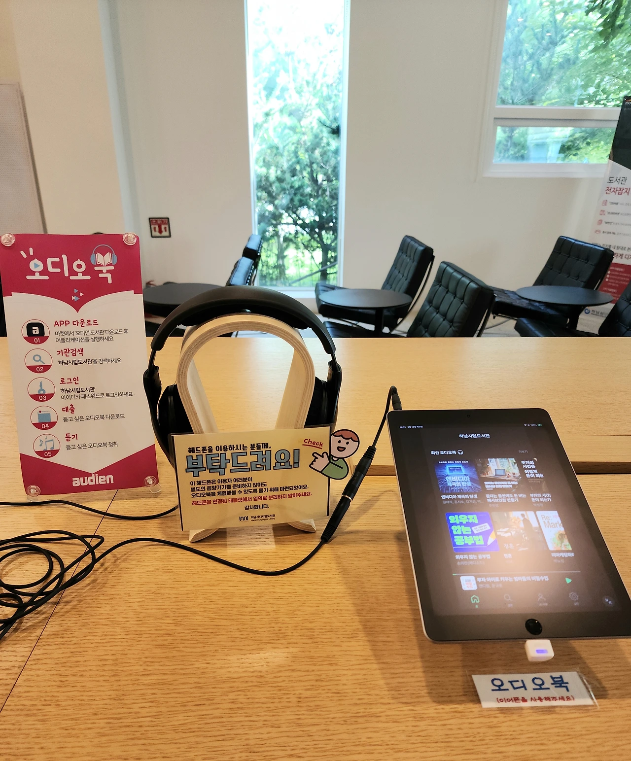 라운지에 있는 긴 테이블에는 5대의 전자패드가 있다. 잡지, 논문, 오디오북, 전자책을 볼 수 있는 전자패드다.