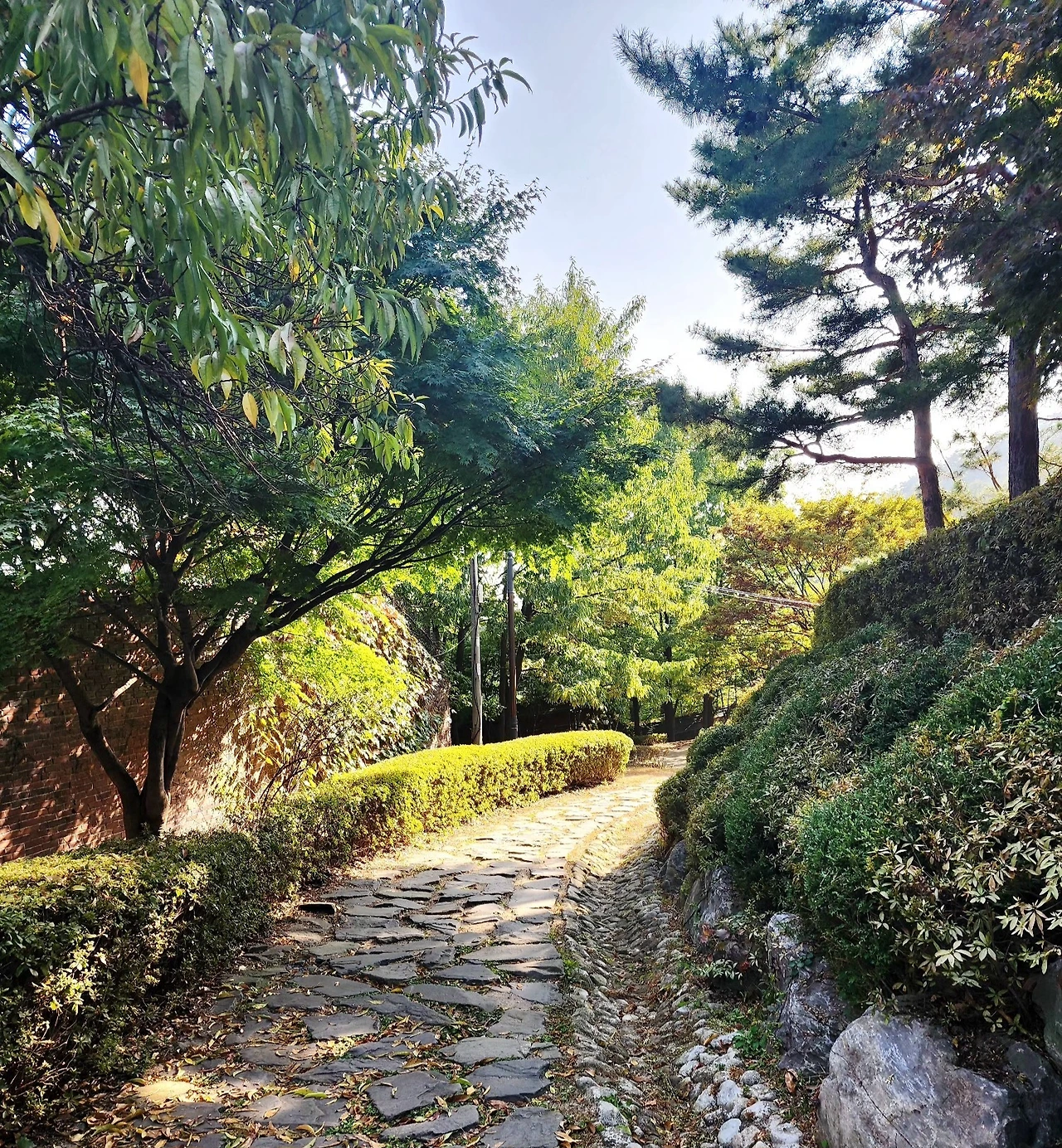이정표대로 왼쪽 아래로 몇 발자국 내려가다 보면 나무들 틈으로 한옥 도서관이 보인다. 오르막길을 오르며 헉헉되던 숨 가쁜 숨소리는 아래에 펼쳐진 한옥 도서관을 보는 순간 평온한 숨소리로 바뀐다.